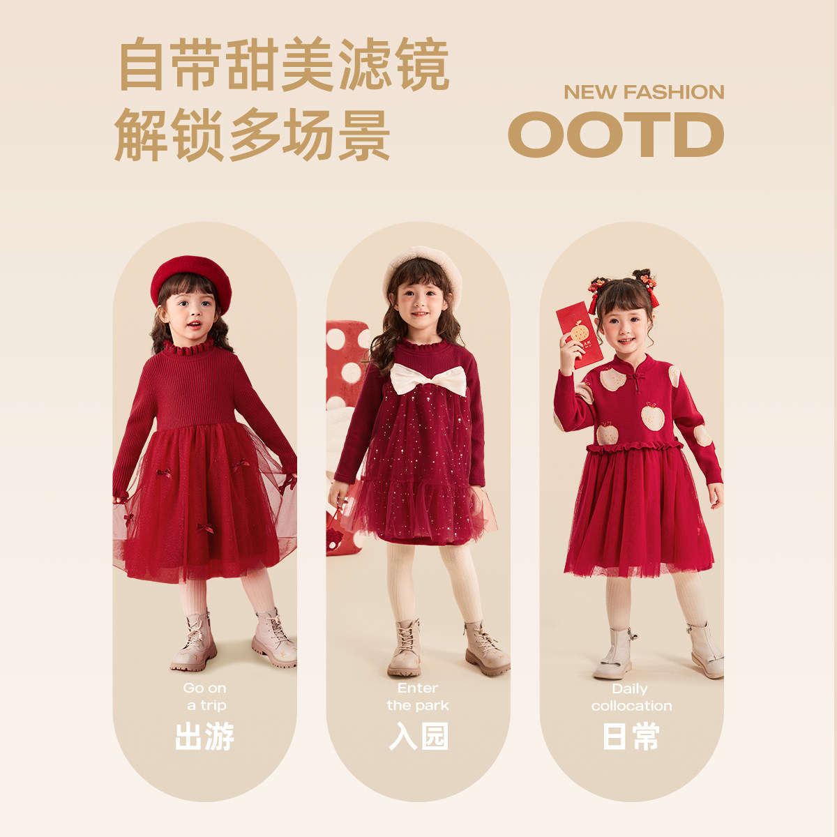 巴拉巴拉女童连衣裙宝宝拜年裙子冬装新款童装儿童红色洋气公主裙