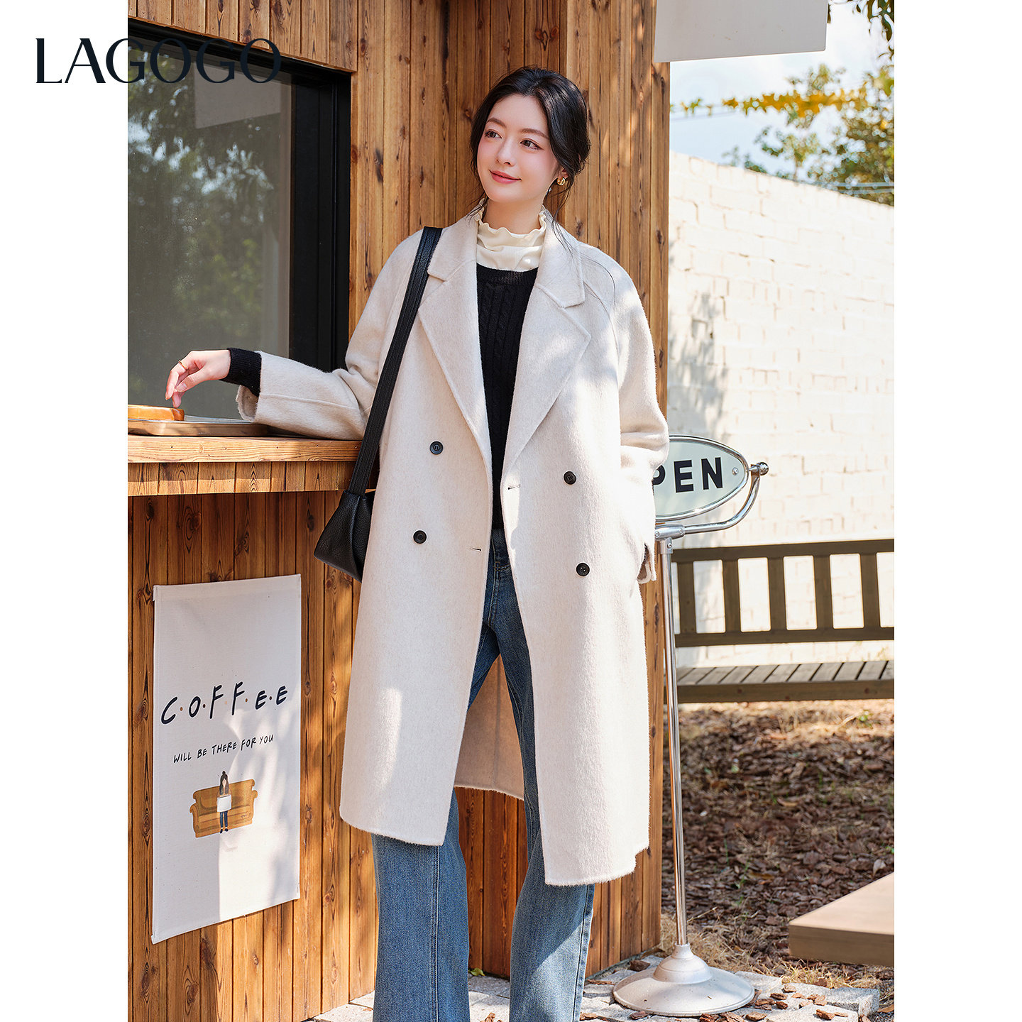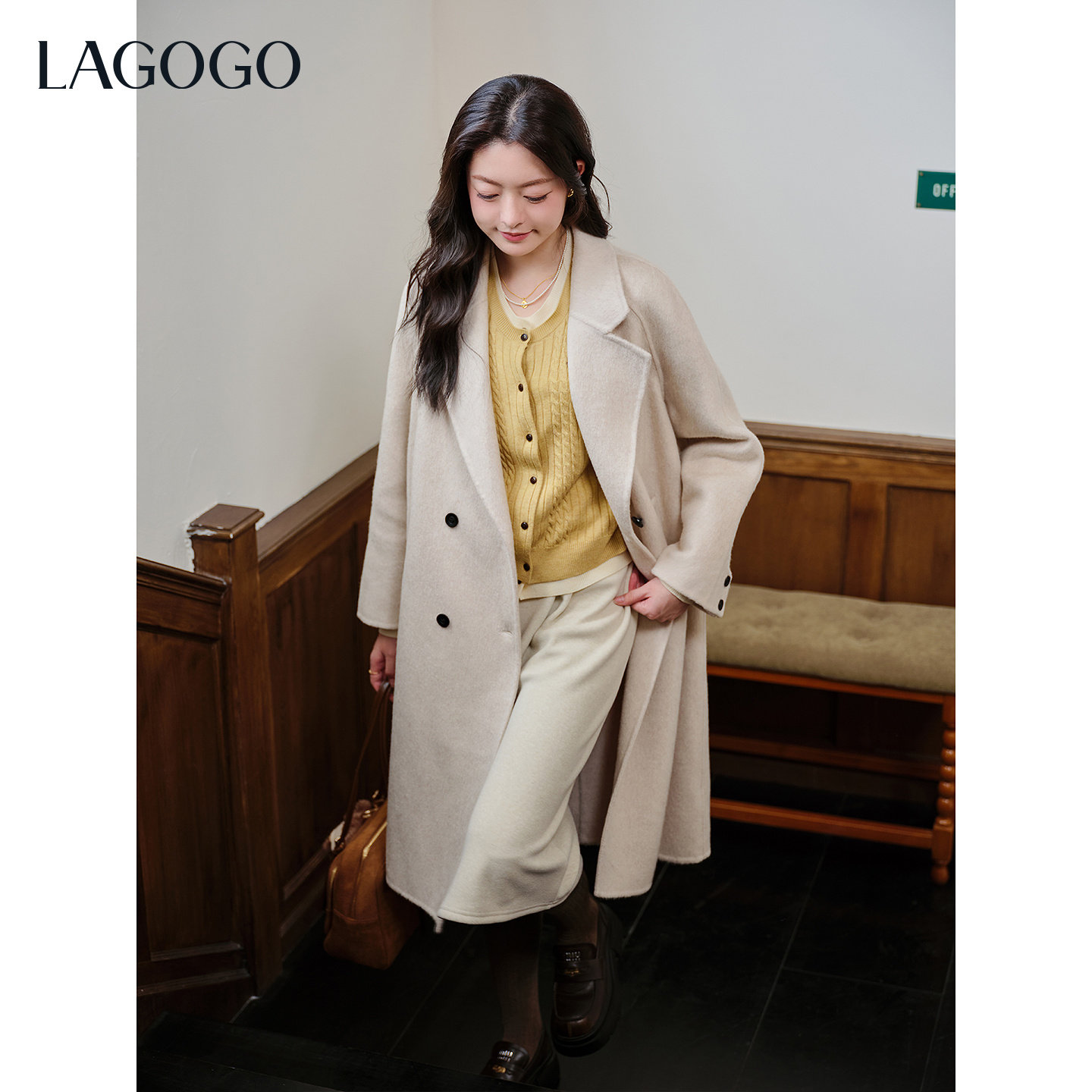 LAGOGO米白色双面呢大衣女拉谷谷2025冬新款长款绵羊毛保暖外套