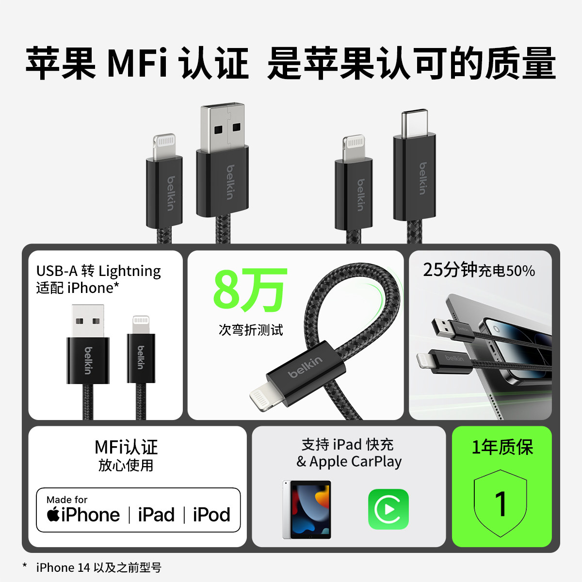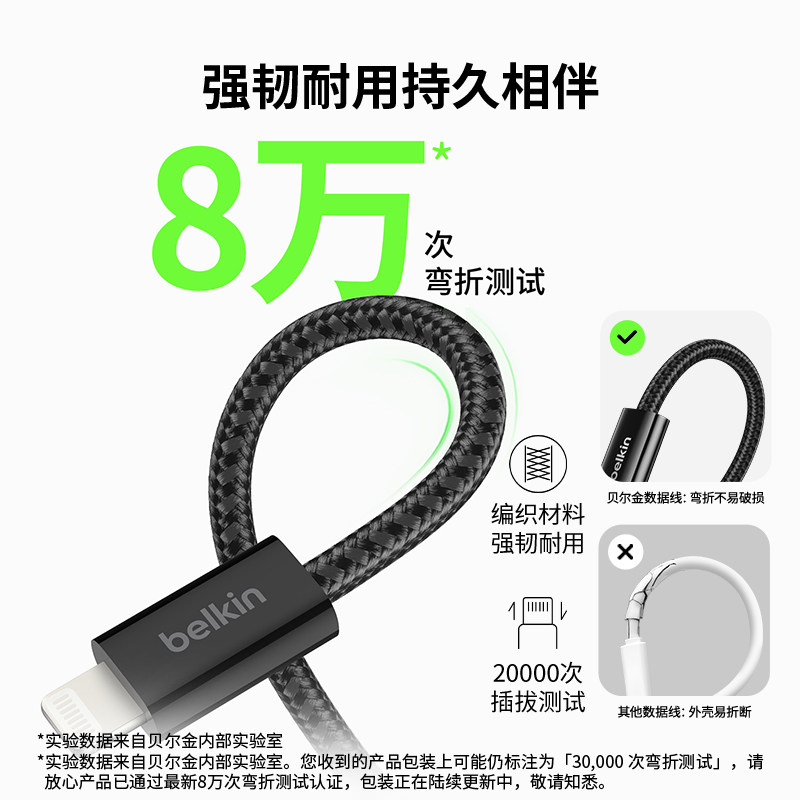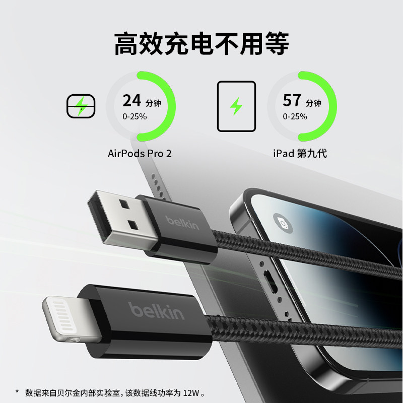 Belkin贝尔金USB-A转L编织数据线适用苹果MFi认证lightning手机充电线适用iPhone14-8系列iPad平板AirPods