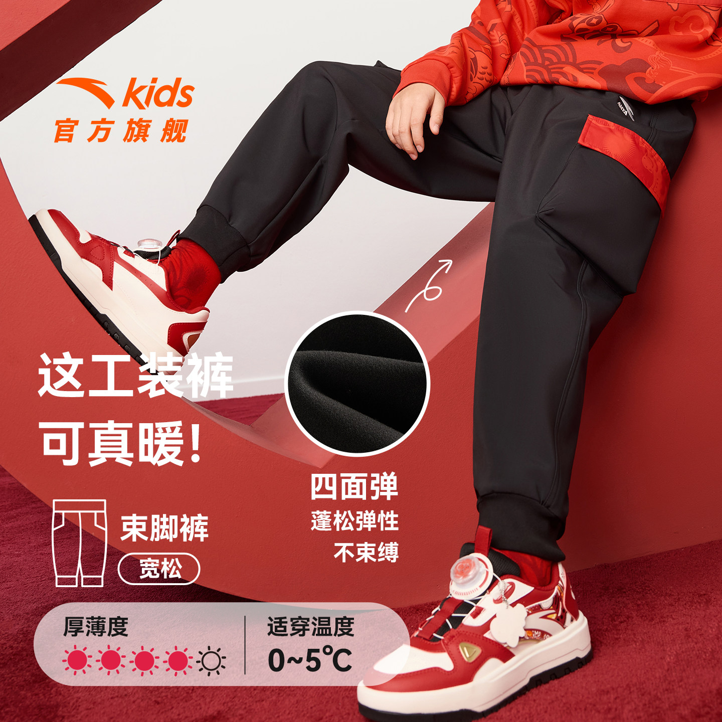 【新年软壳】安踏儿童装男童加绒裤子2026新款拜年衣服工装运动裤