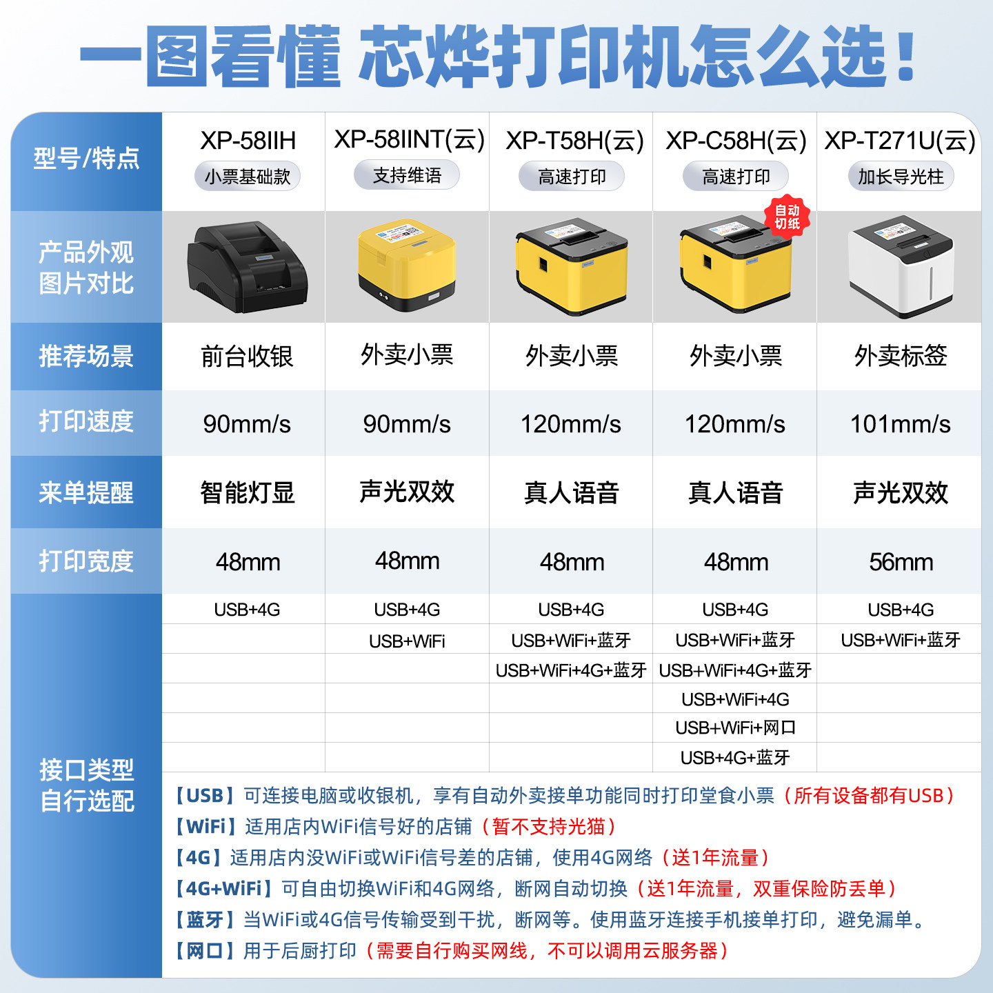 芯烨云xprinter美团饿了么京东秒送抖音小程序自动接单多平台自动切纸飞鹅无线蓝牙WIFI4G热敏小票外卖打印机
