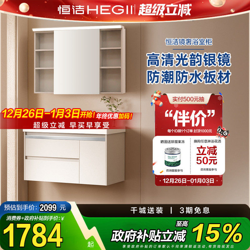 【下拉领补贴】恒洁铝合金浴室柜陶瓷一体盆大容量储物洗手盆柜