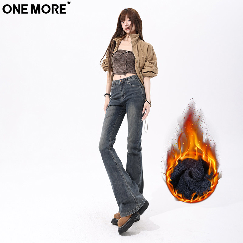 One More美式复古低腰微喇叭牛仔裤女加绒保暖冬季弹力加厚喇叭裤