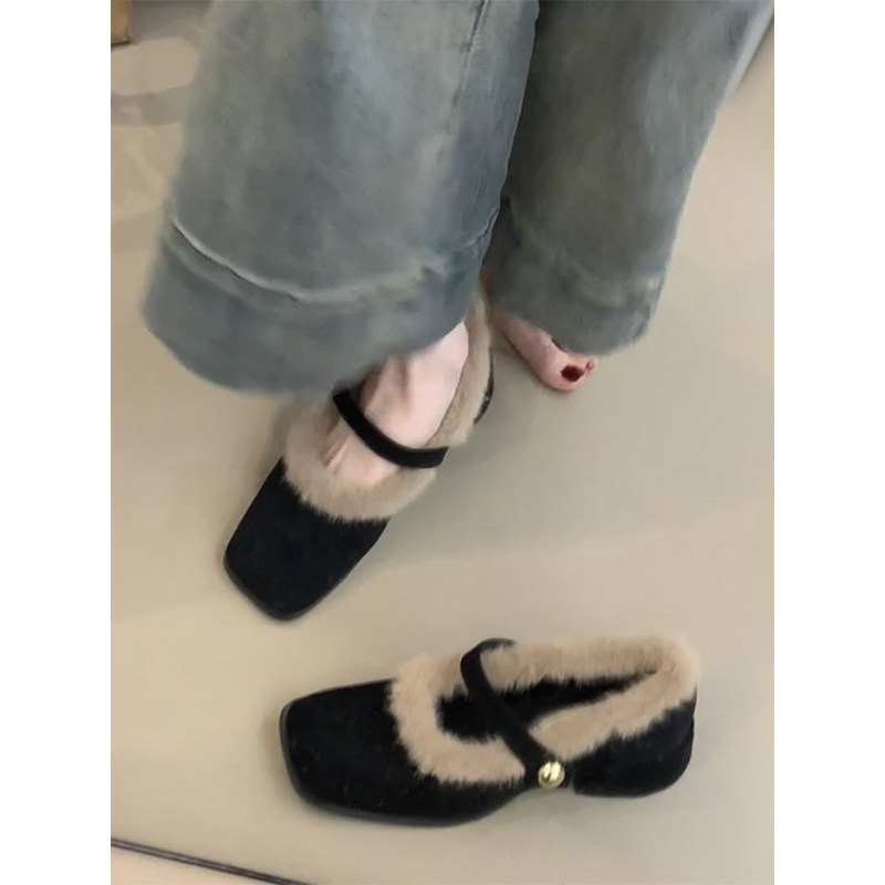 羊皮版复古玛丽珍鞋女方头秋冬季加绒保暖毛毛棉鞋平底晚晚单鞋女