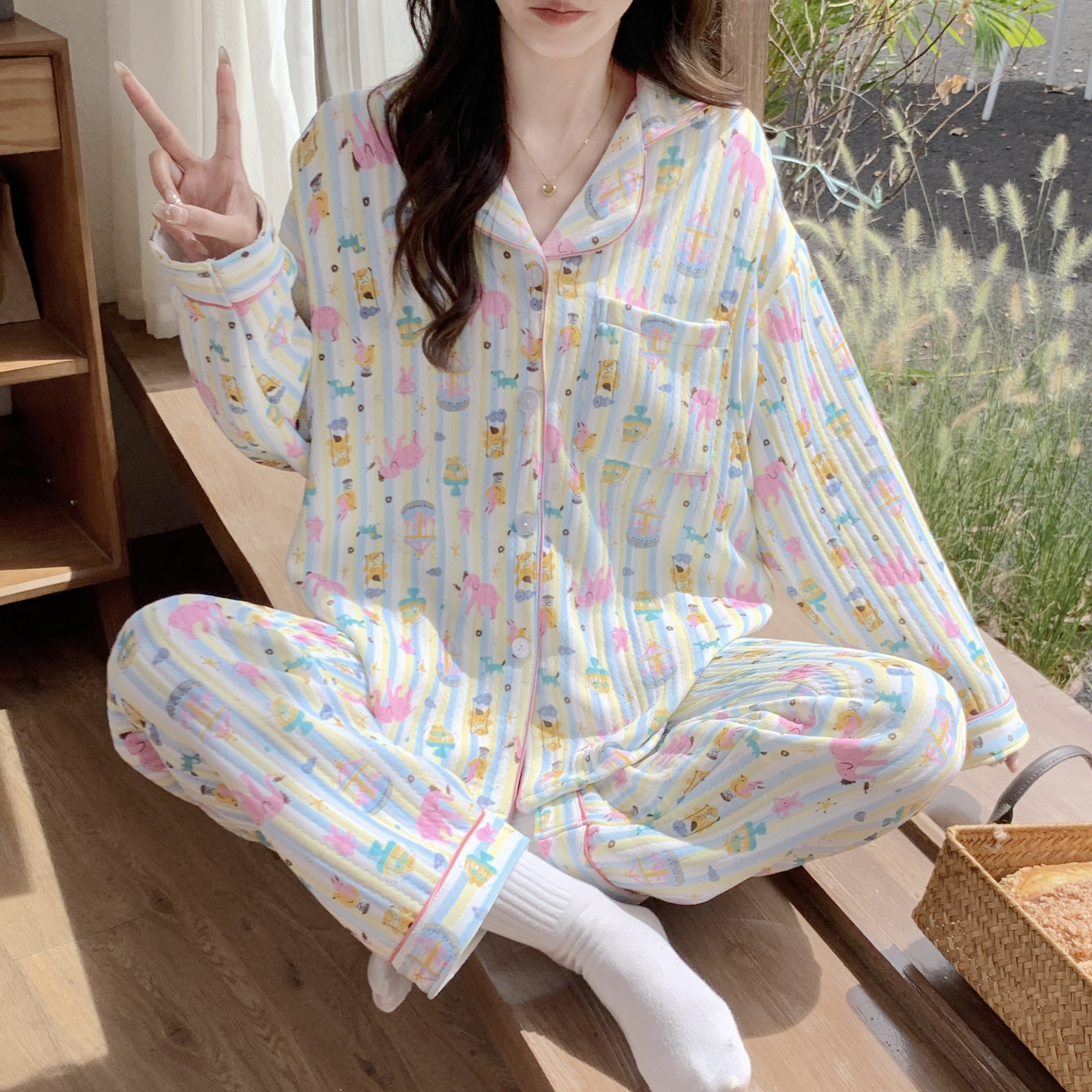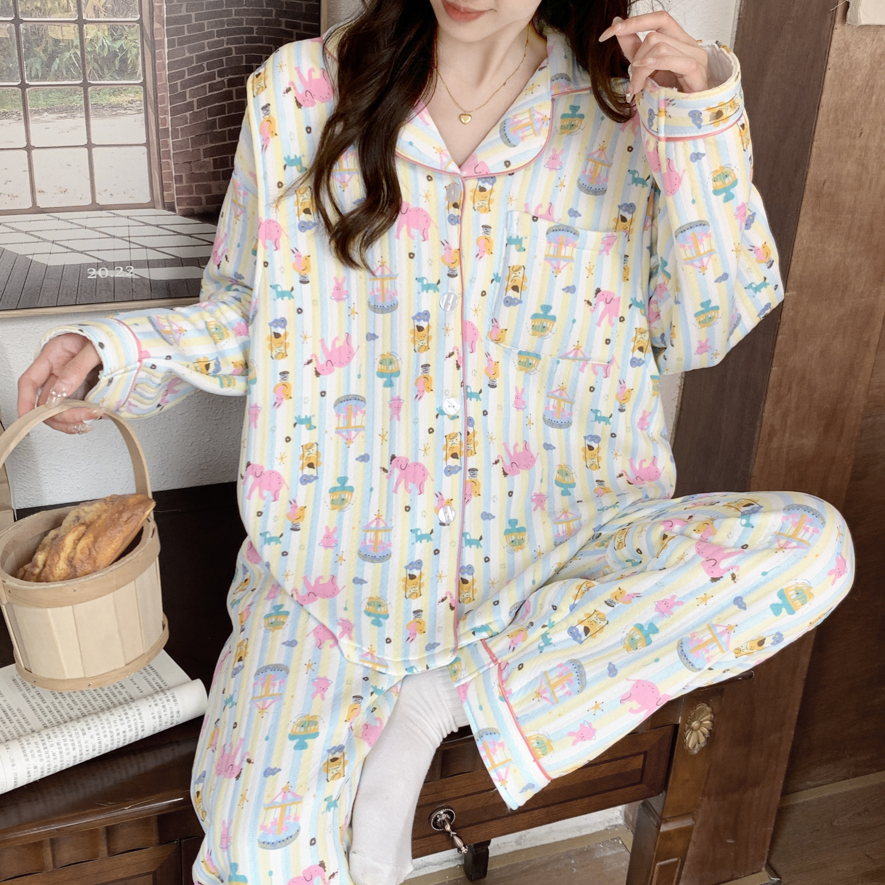 带胸垫奶香风纯棉月子服春秋季产后产妇孕妇睡衣秋冬款哺乳喂奶衣