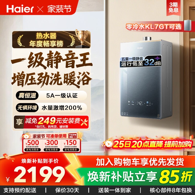 海尔燃气热水器16KL7PRO家用天然气静音恒温增压零冷水可选KL7GT