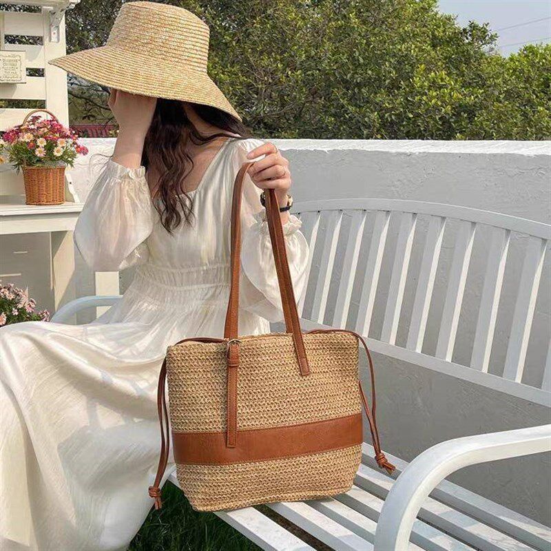新款草编包百搭款女包车缝线PU抽带时尚纸绳单肩编U织包度假沙滩