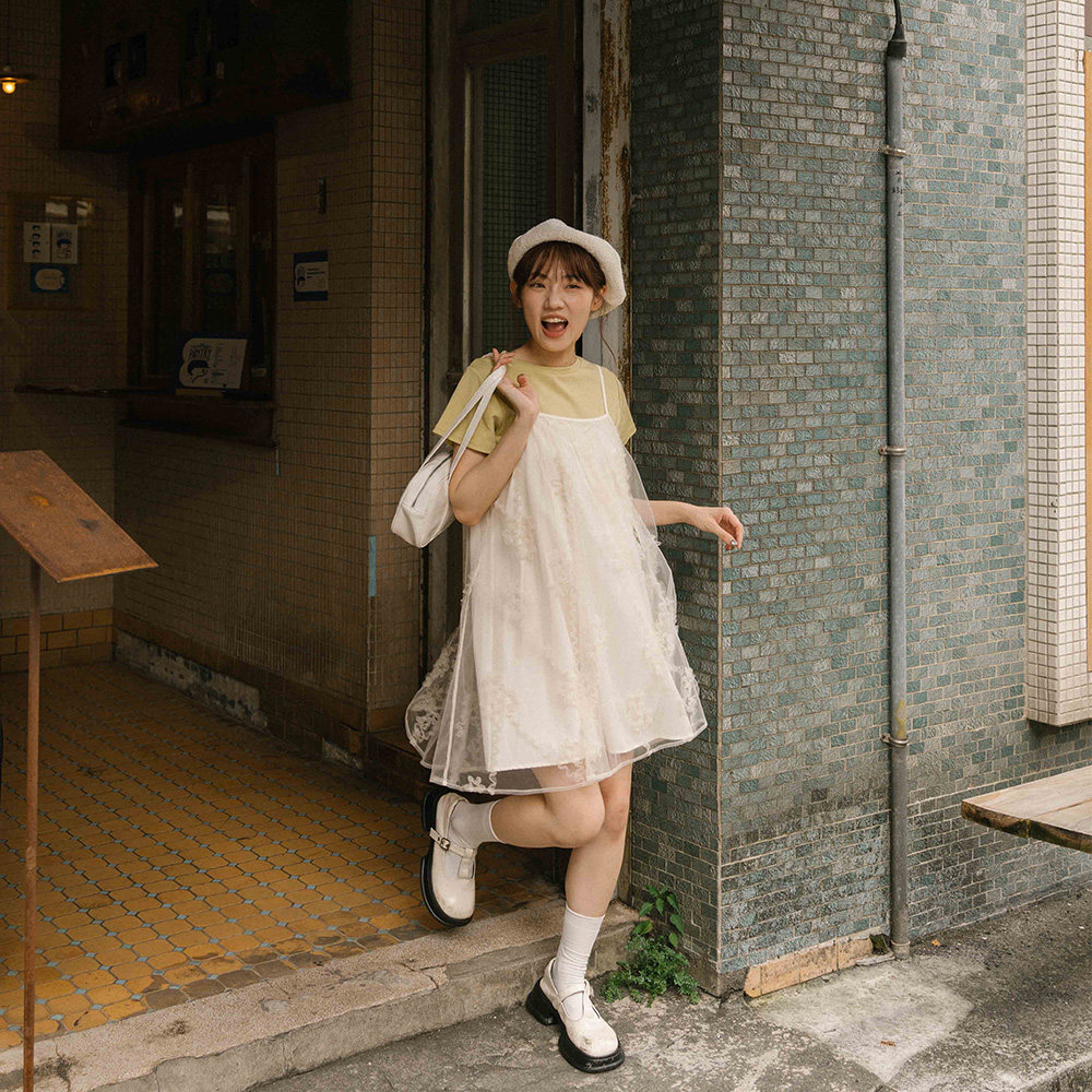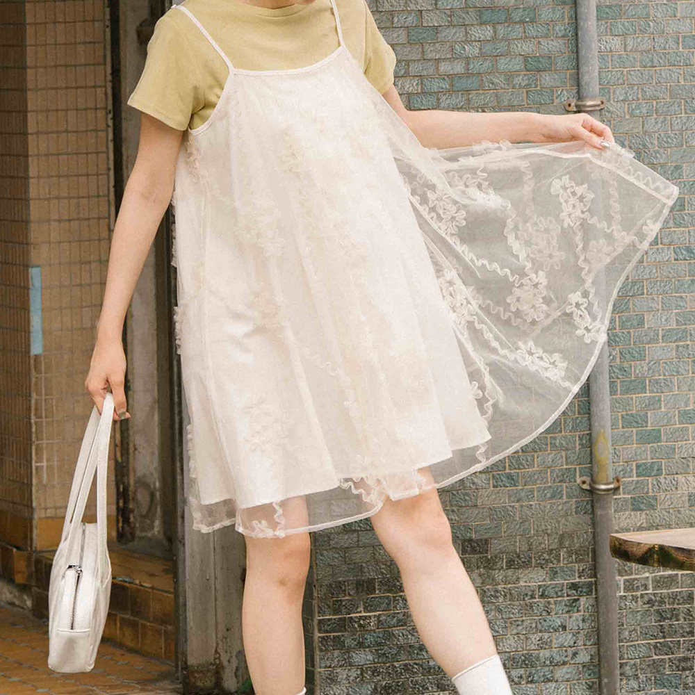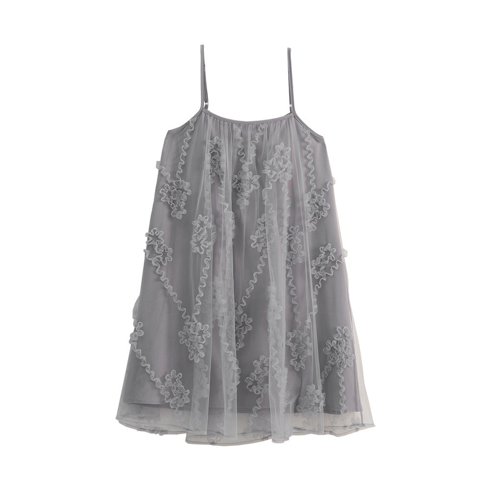 QUEENSHOP 2025秋冬新品女装立体花花网纱细肩双层连衣裙01087099