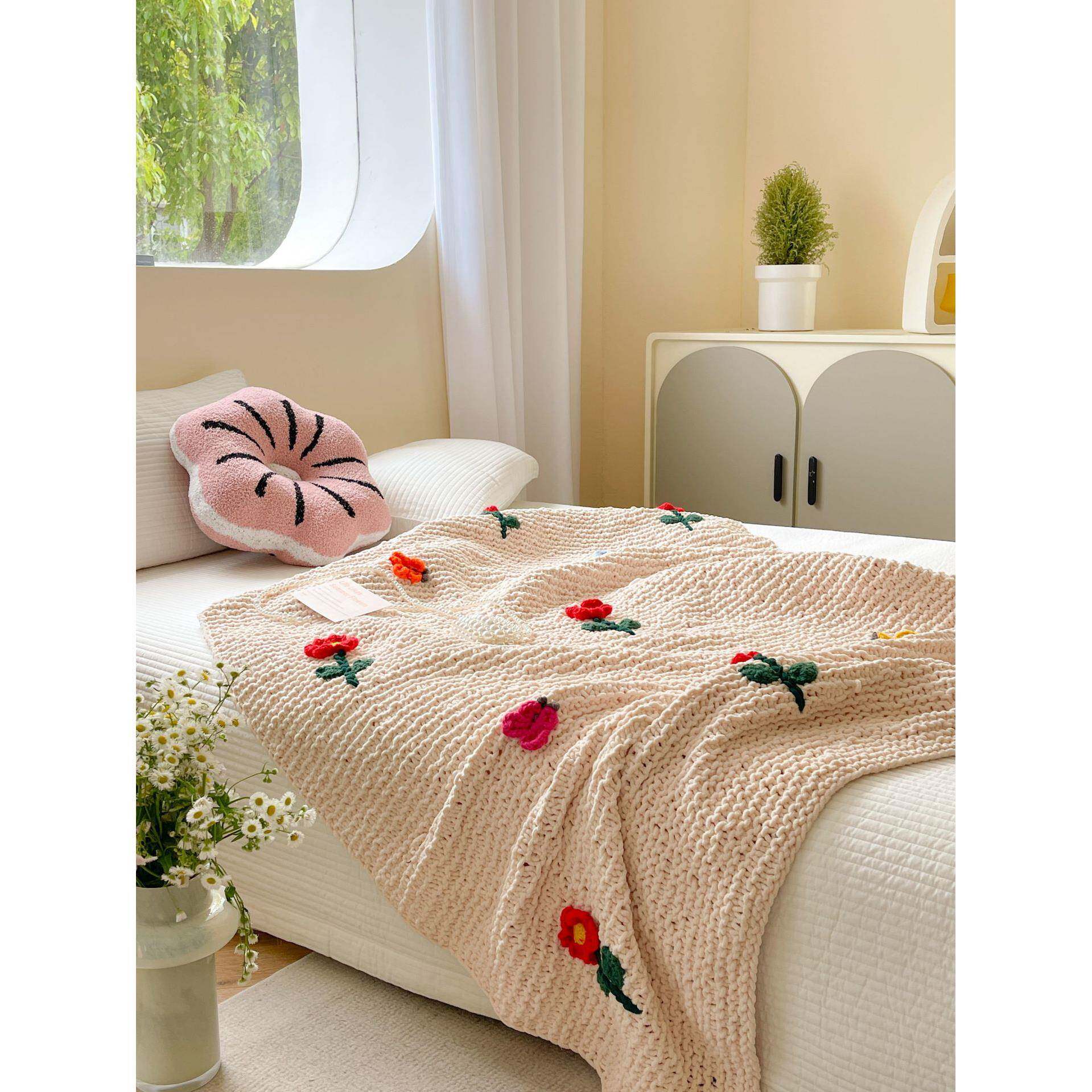纯手工重工棒针线毯粗毛线毯子民宿风立体花朵盖毯冰条绒毛毯