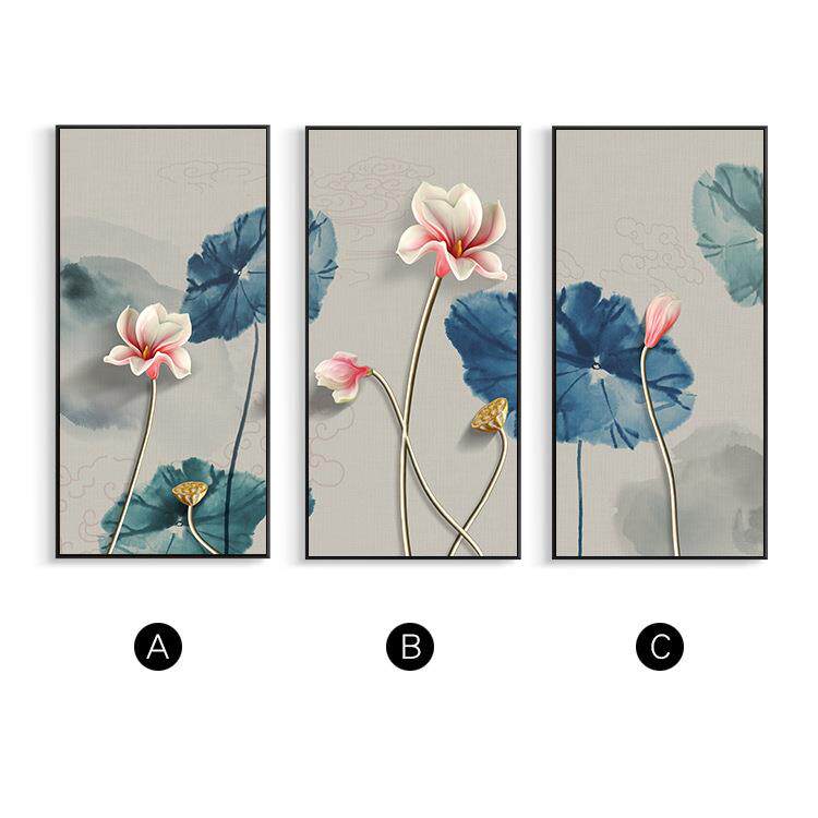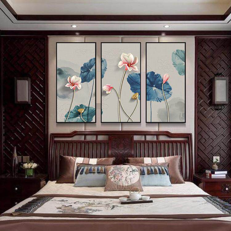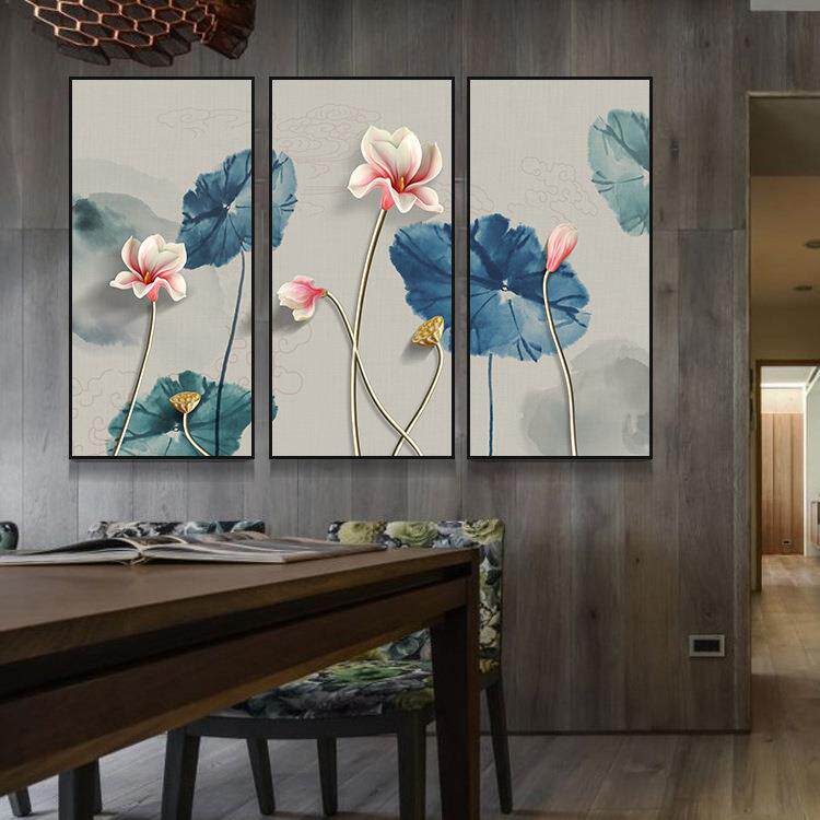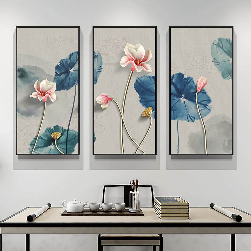 新中式复古荷花装饰画客厅现代简约玄关走廊沙发背景三联客厅挂画