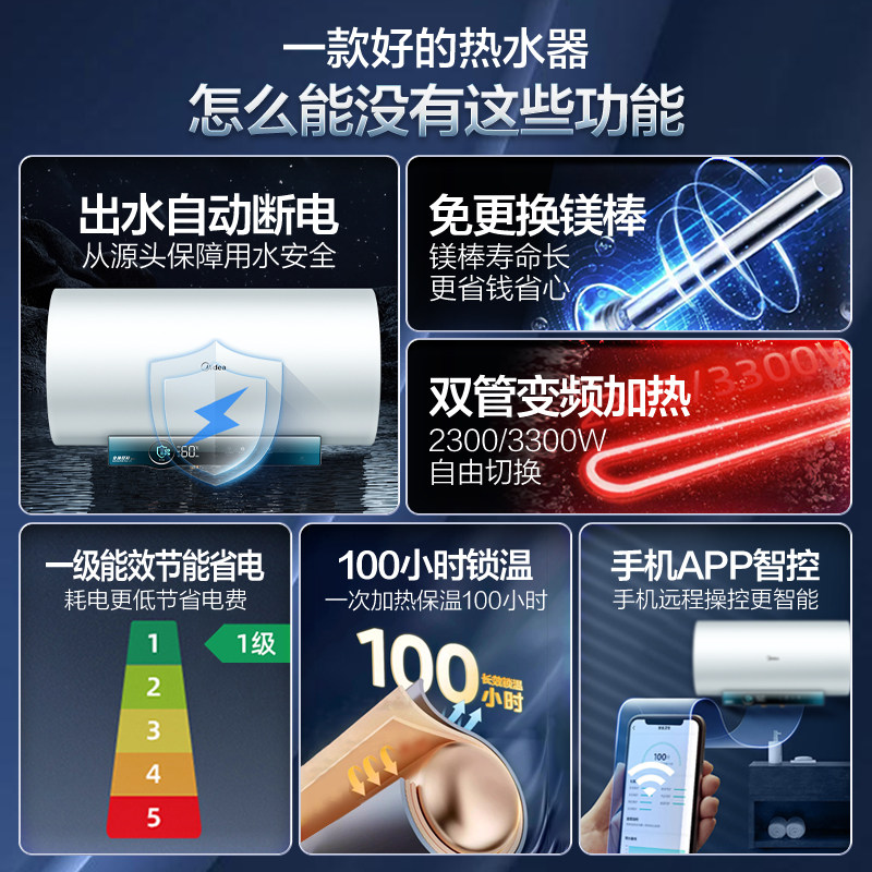 美的变频电热水器出水断电一级能效60升80L洗澡家用速热储水式JA5