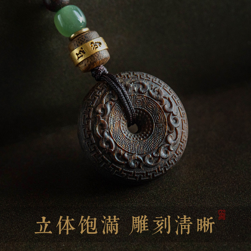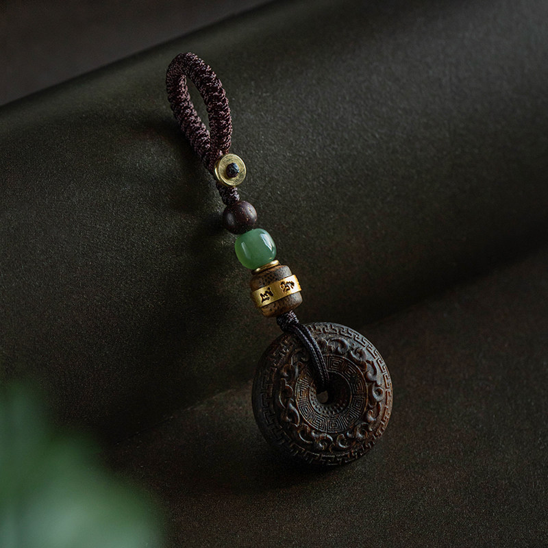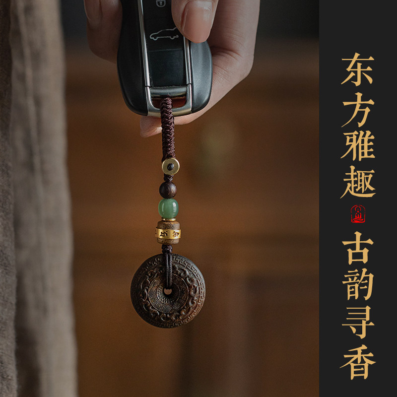 沉香木平安扣汽车钥匙扣新款纯银六字真言小挂件本命年钥匙链礼物