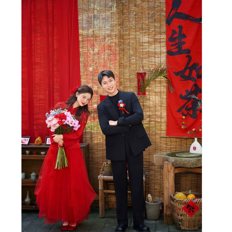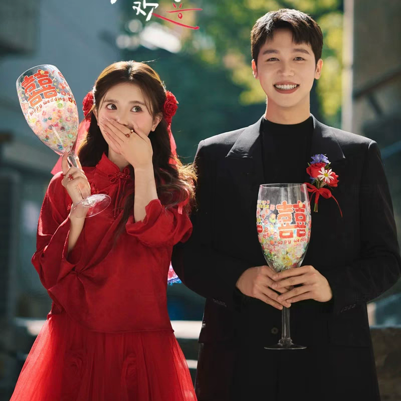 新中式年代感婚纱摄影道具外景街拍秀禾汉服拍照酒杯手捧花红头纱