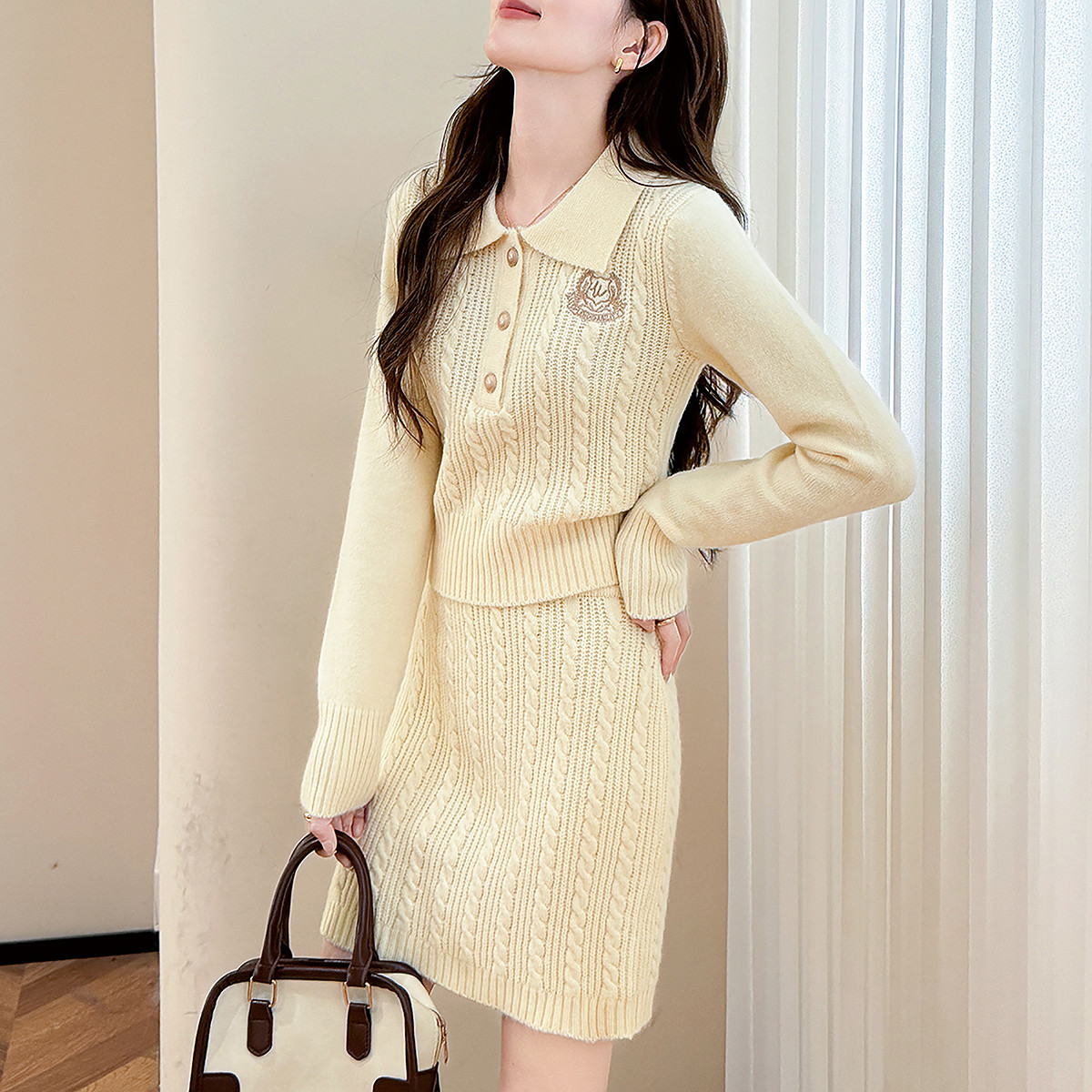 唐狮秋季套装女上下两件套减龄高级感复古风翻领套头和半裙女装tu