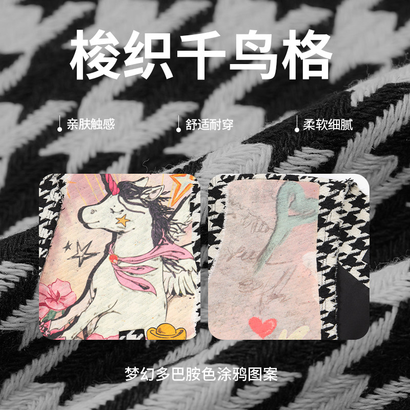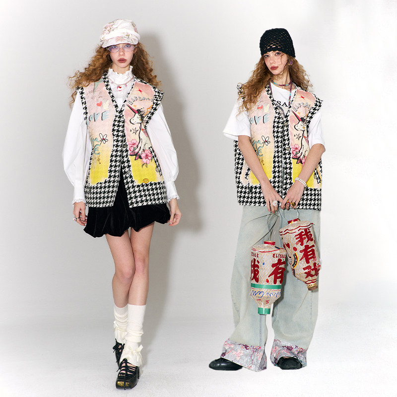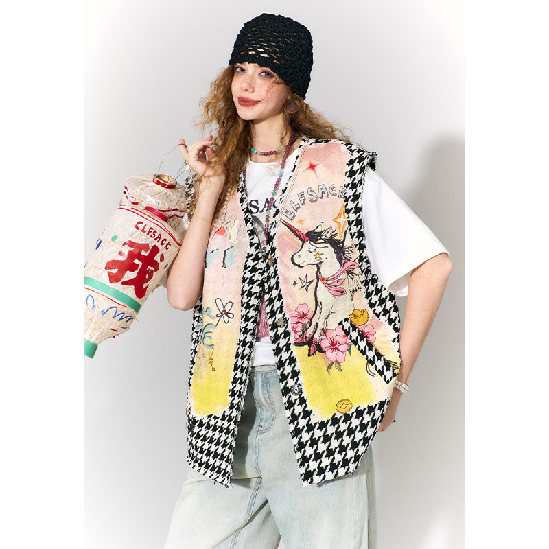 妖精的口袋千鸟格拼接涂鸦印花马甲女2026早春新款叠穿设计感坎肩