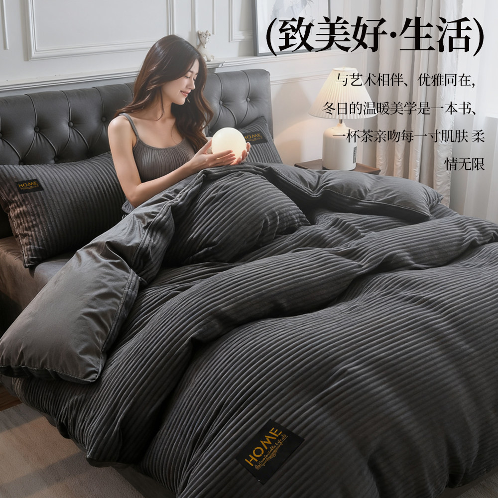秋冬季四件套纯色加厚保暖牛奶绒床品被罩珊瑚绒床单床笠奶油条纹