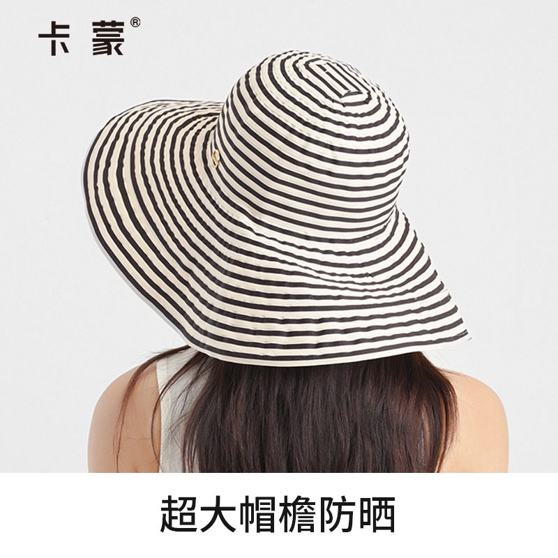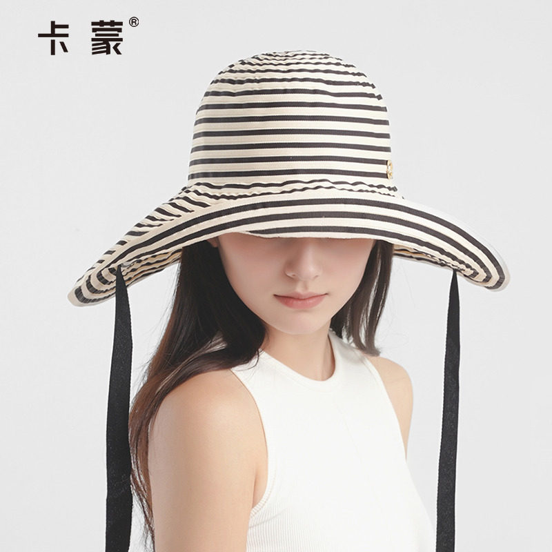 日系可折叠夏季条纹渔夫帽女新款长防晒帽子时尚盆帽大头围太阳帽
