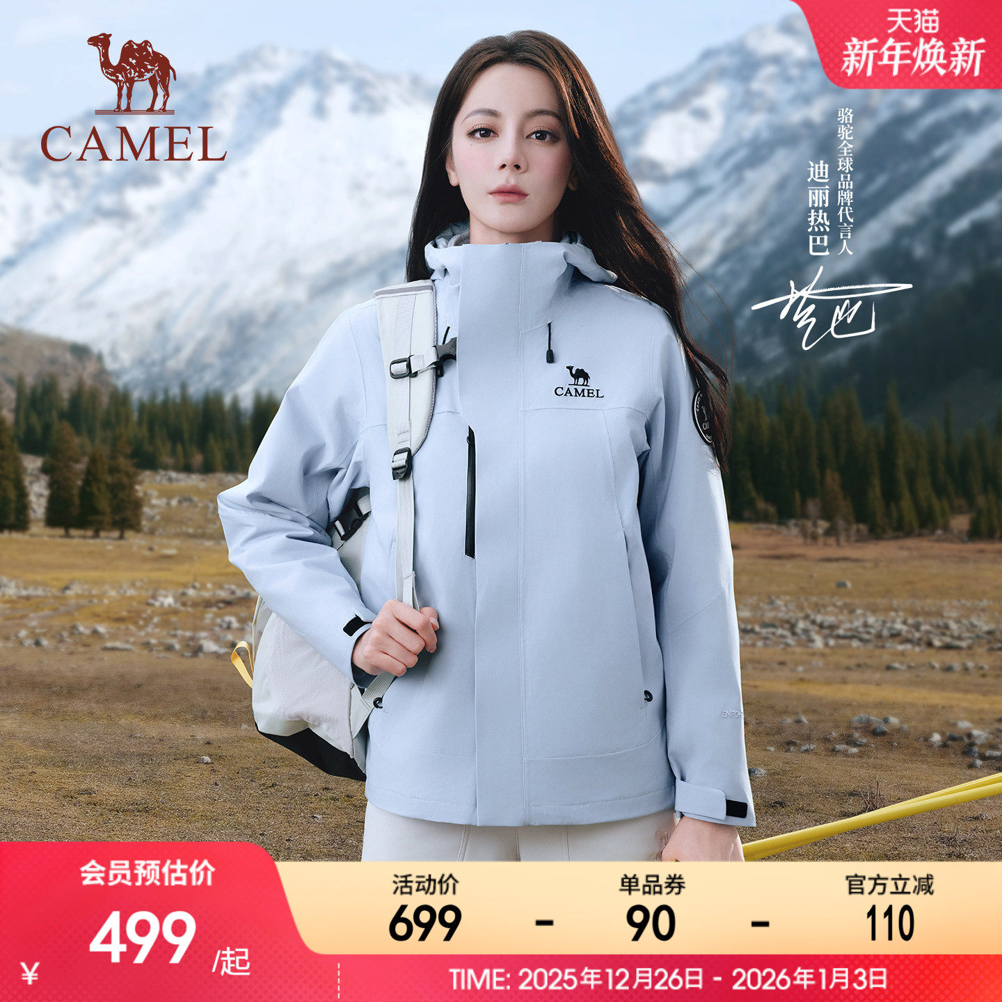 迪丽热巴同款|骆驼冲锋衣女三合一鹅绒内胆羽绒服2025新款外套男