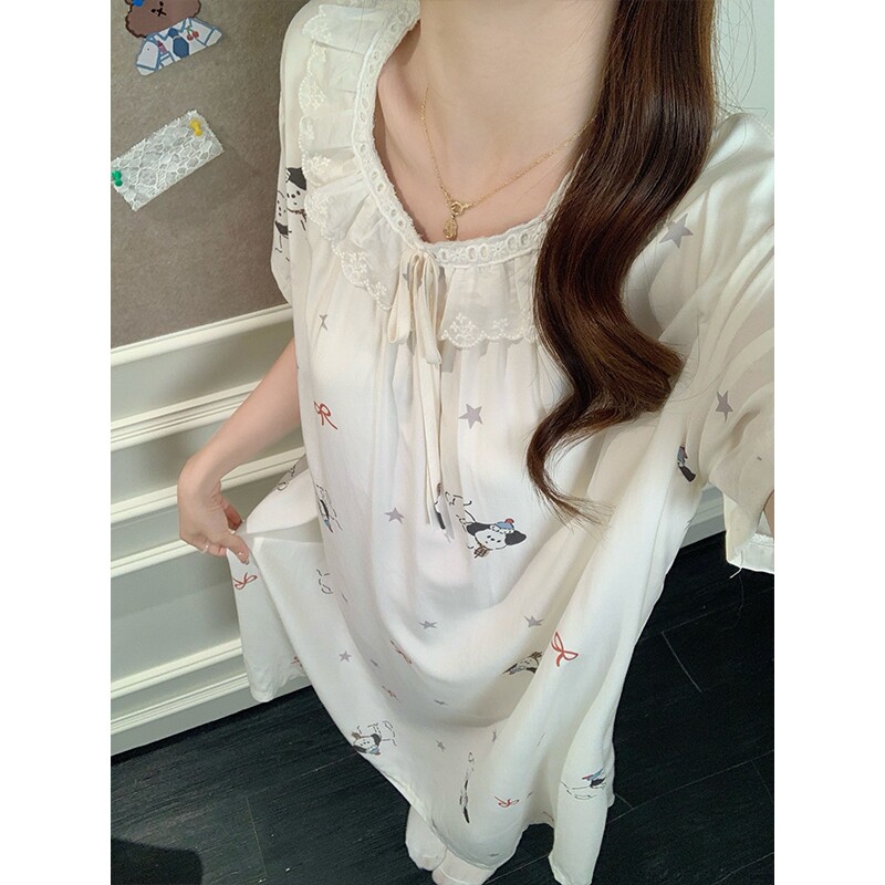 夏季短袖睡裙女带胸垫可爱卡通少女棉绸过膝奶fufu睡衣女士家居服