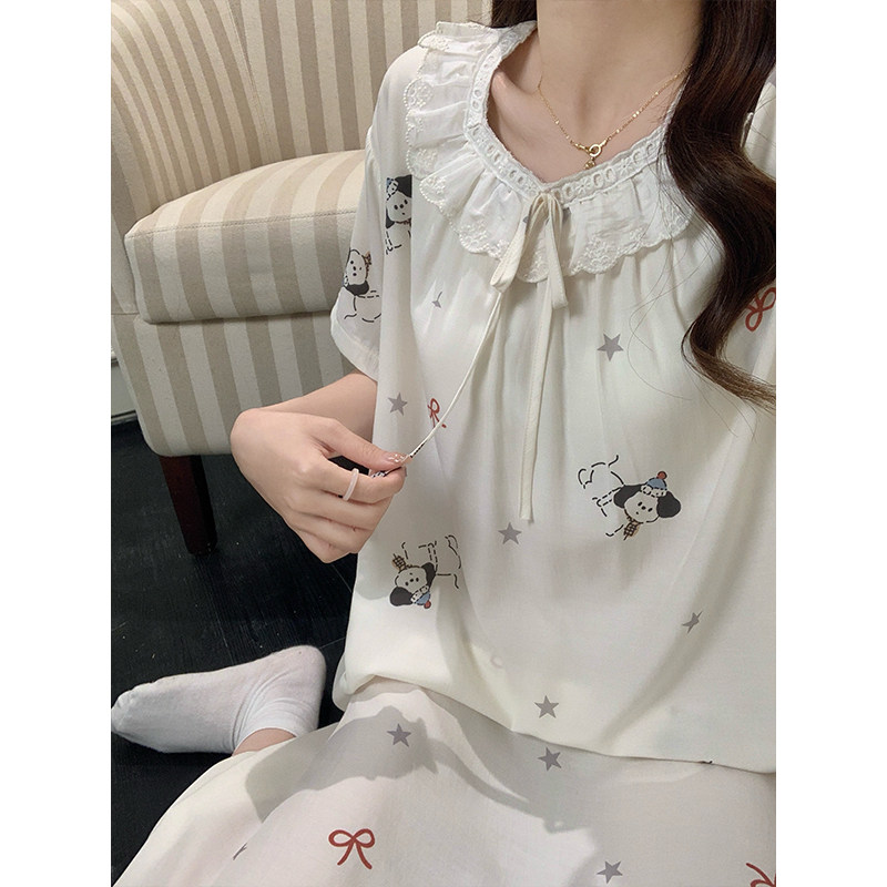 韩版加长款棉绸睡裙女士短袖加大码睡衣夏季人造棉宽松舒适居家服