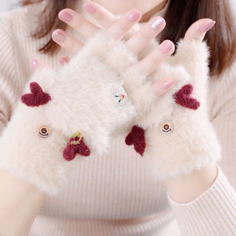 手套女学生可爱冬季骑车女士半指写字加厚加绒秋季保暖天翻盖猫爪