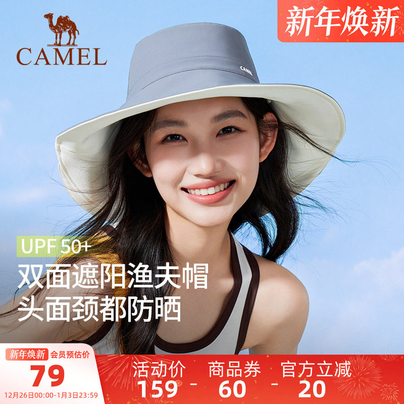 骆驼双面遮阳渔夫帽2025夏季新款女防紫外线upf50+大帽檐防晒帽子