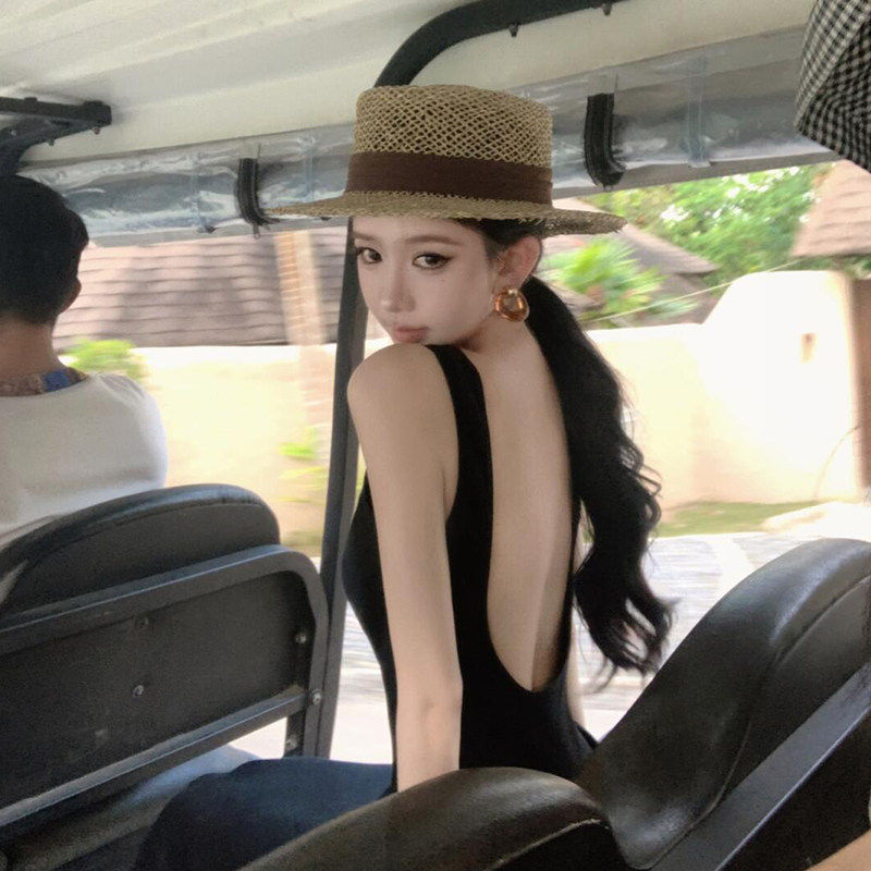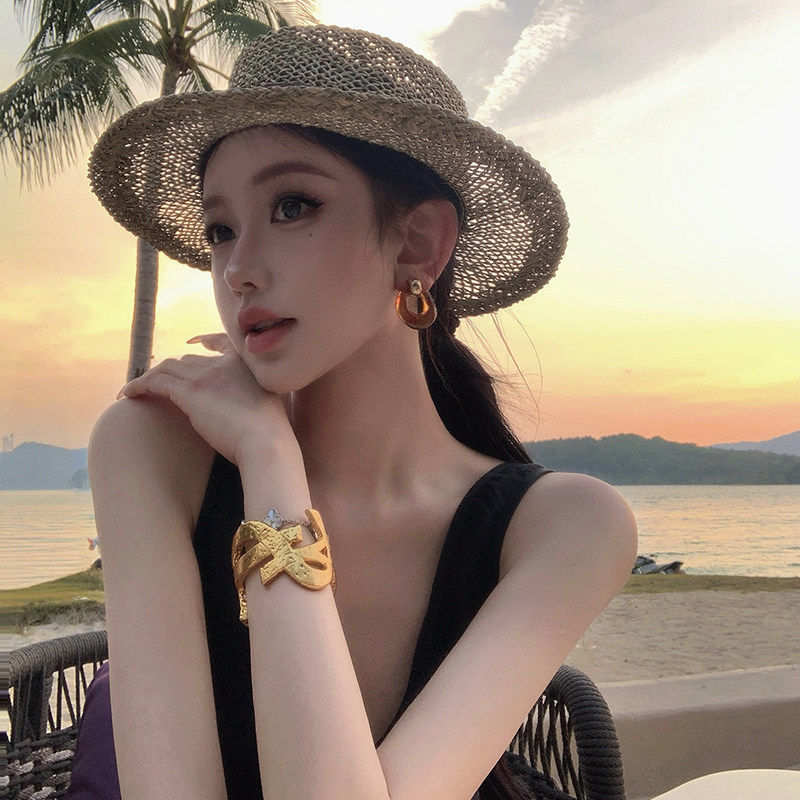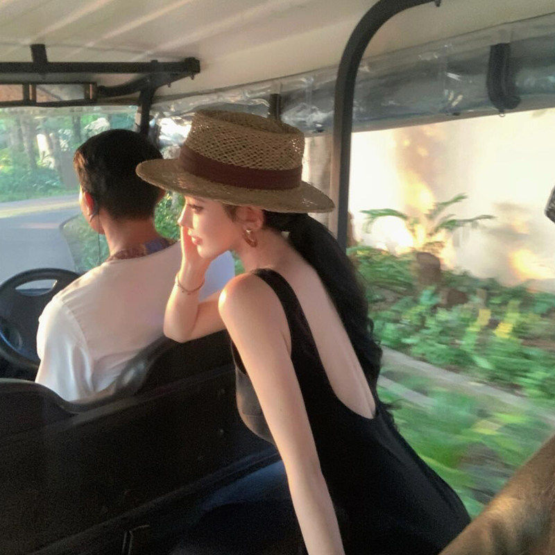 2026新款法式老钱风平顶镂空草帽子女款春夏季度假礼帽防晒遮阳帽