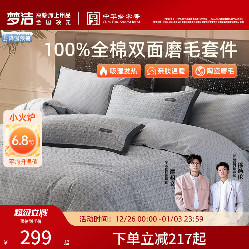 梦洁家纺全棉双面磨毛四件套纯棉床品加厚保暖秋冬季床单被套套件