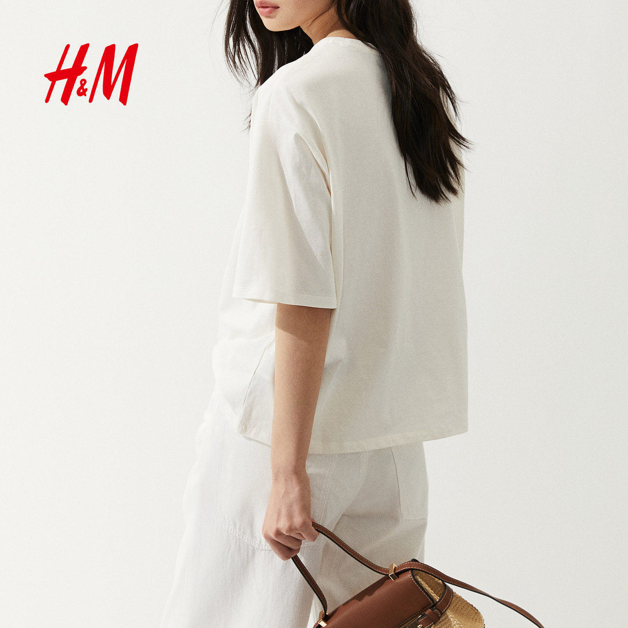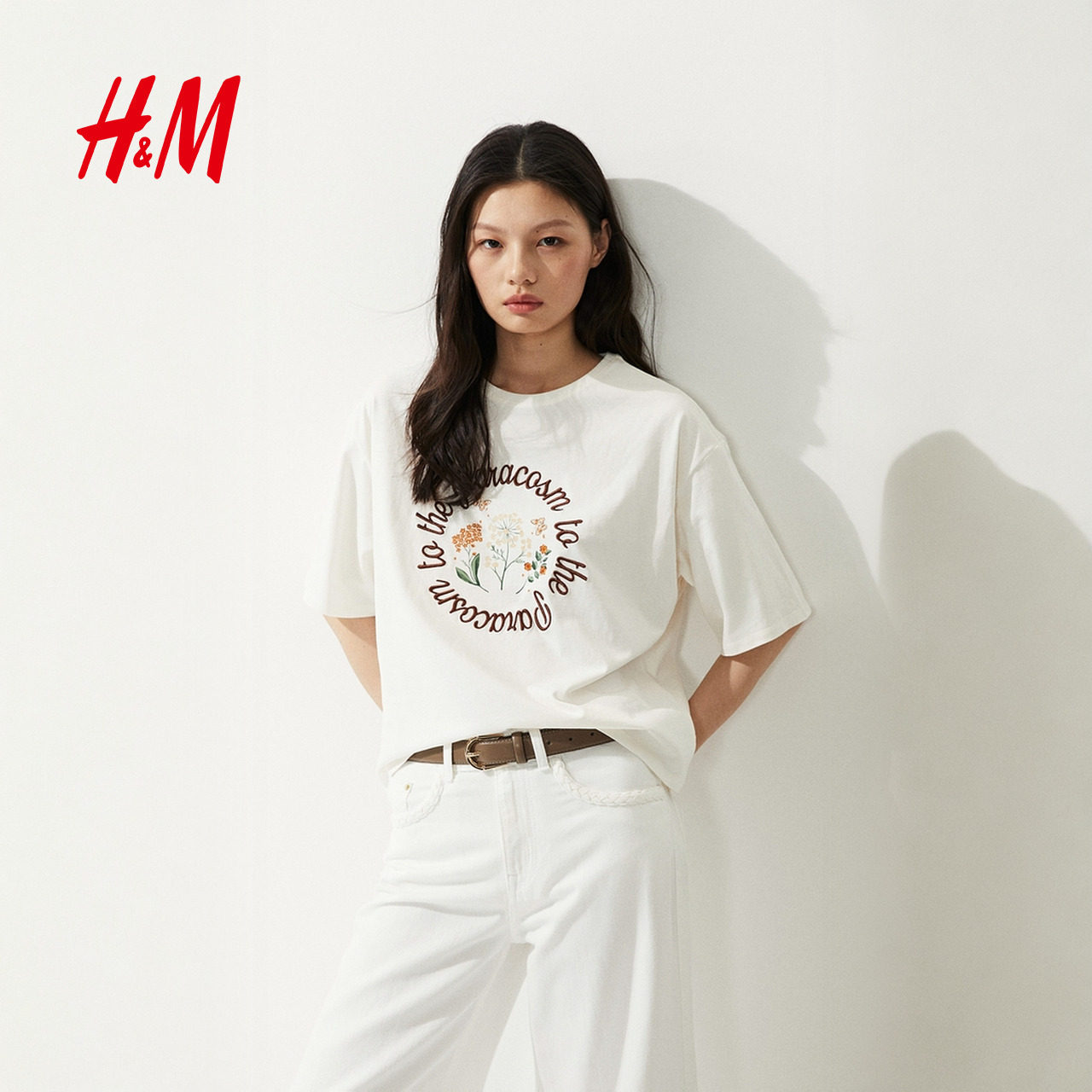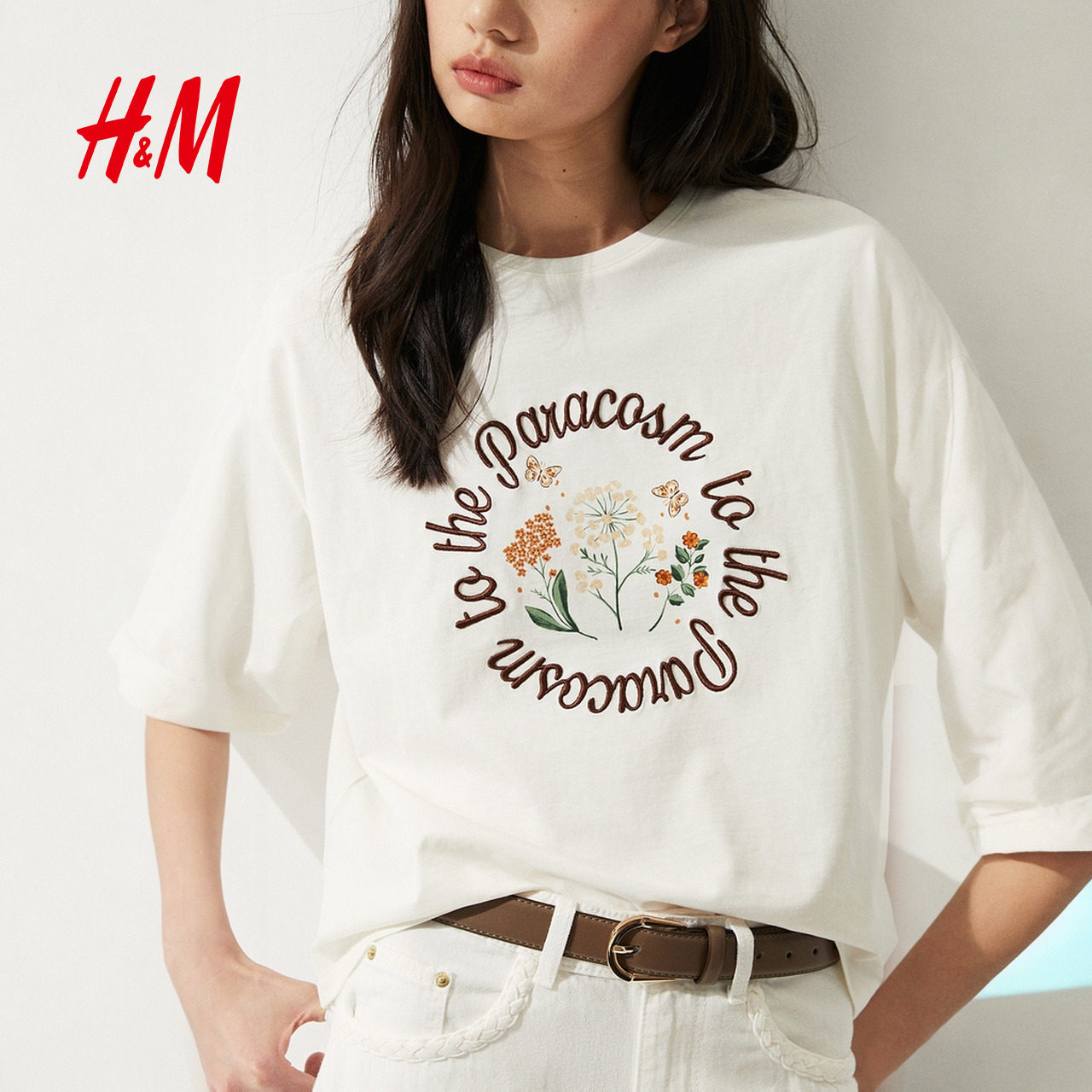 HM女装T恤冬季宽松印花美式圆领图案落肩中袖上衣1287801
