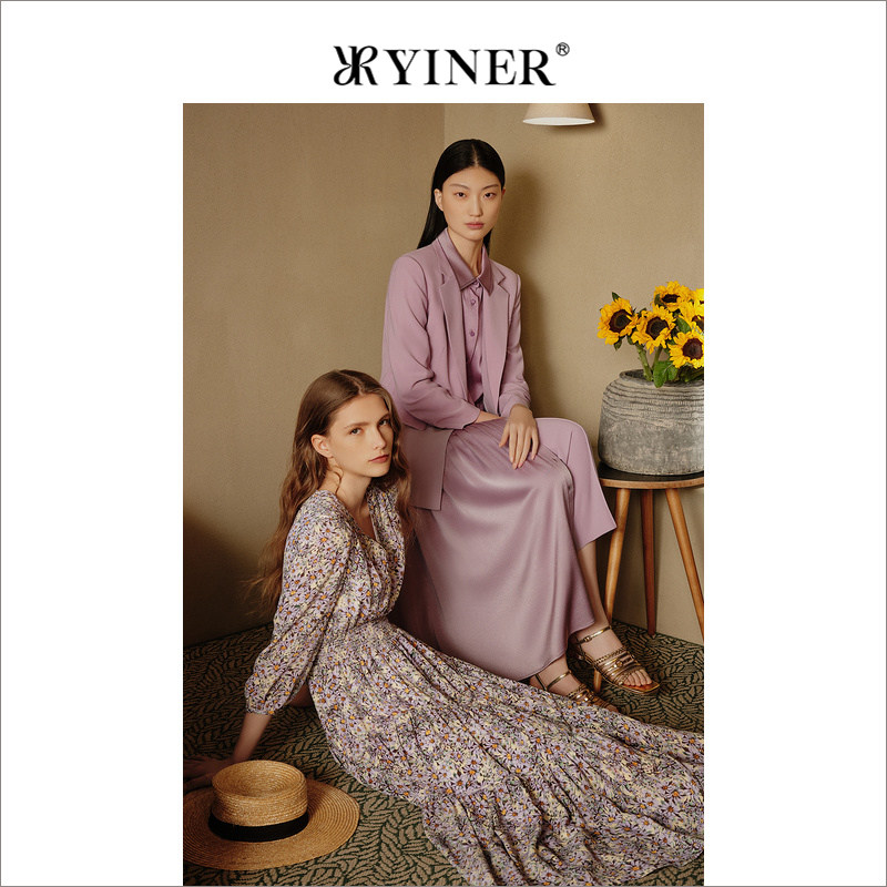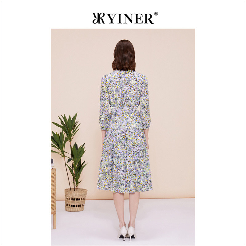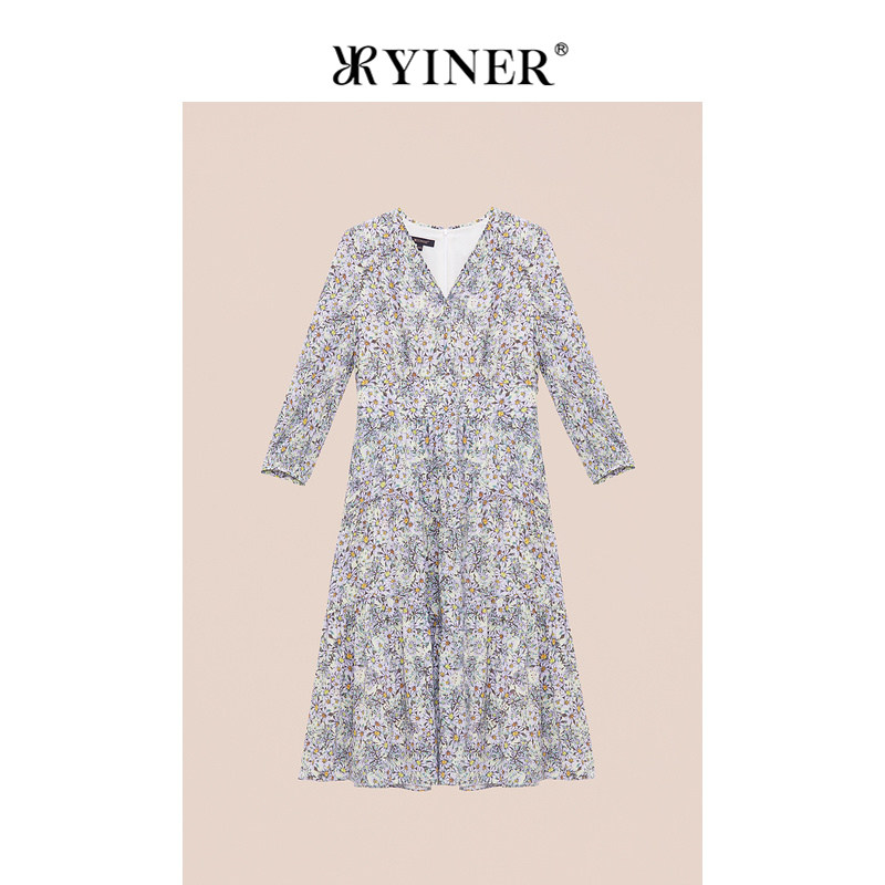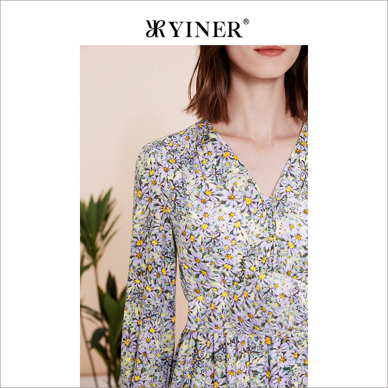 YINER音儿春季时尚V领真丝碎花印花桑蚕丝A字连衣裙