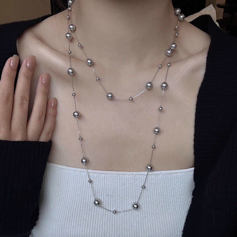 施家真多麻灰色珍珠项链颈链轻奢小众毛衣链配饰女款2025新款爆款