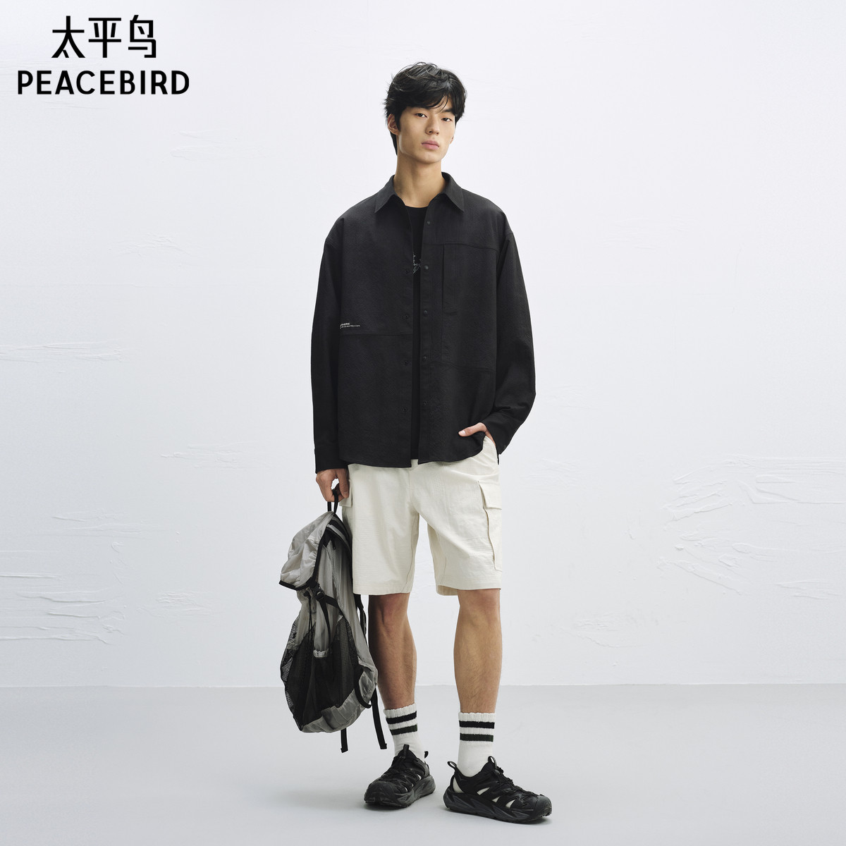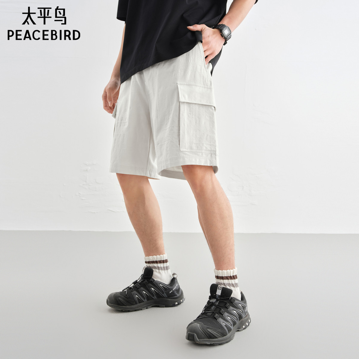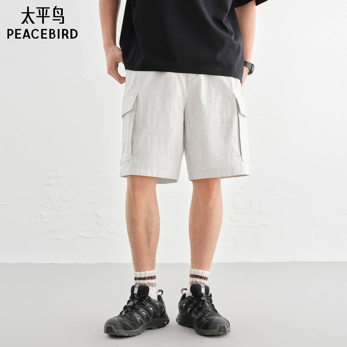 太平鸟男装肌理提花直筒休闲裤秋季纯色工装中短裤潮流