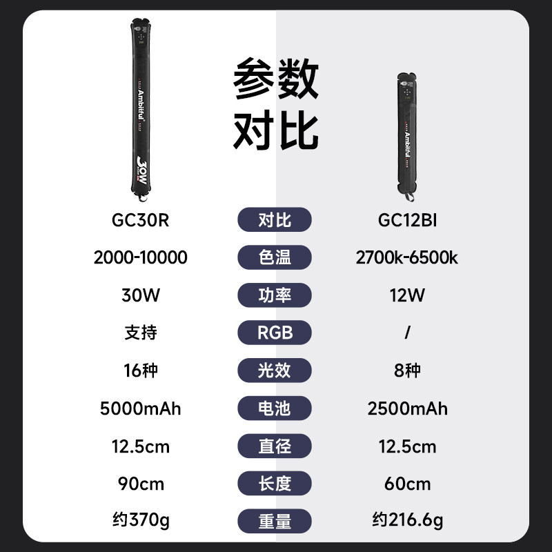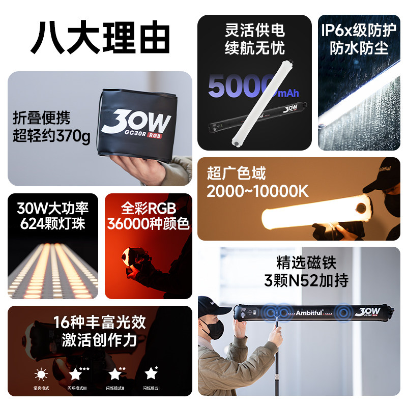 【新品】Ambitful志捷GC30R气柱灯30W全彩磁吸LED灯手机直播打光灯便携式拍摄视频户外摄影相机拍照充气棒灯