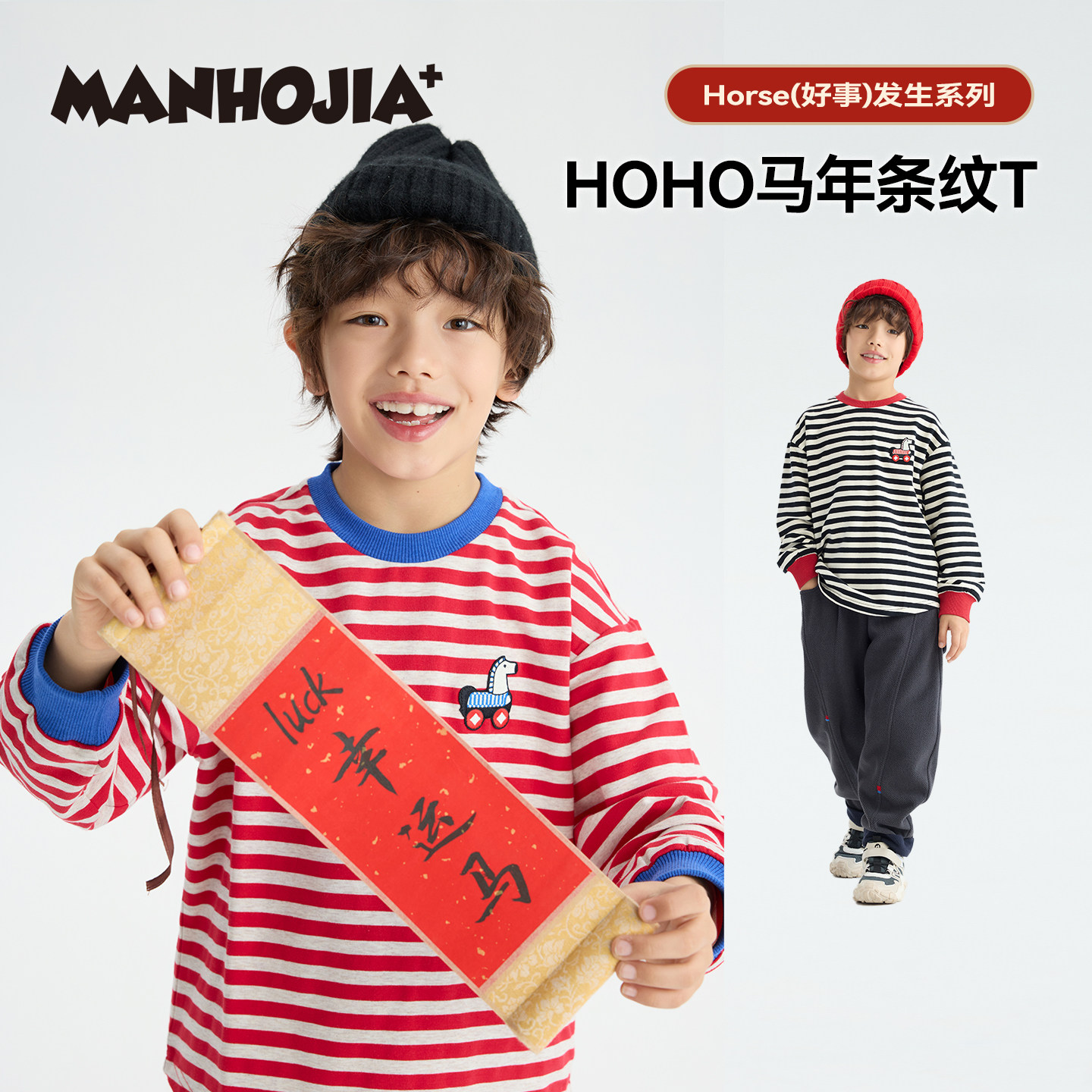 MANHOJIA【好运小马T】儿童长袖新年好事发生小马棉亲子条纹T恤