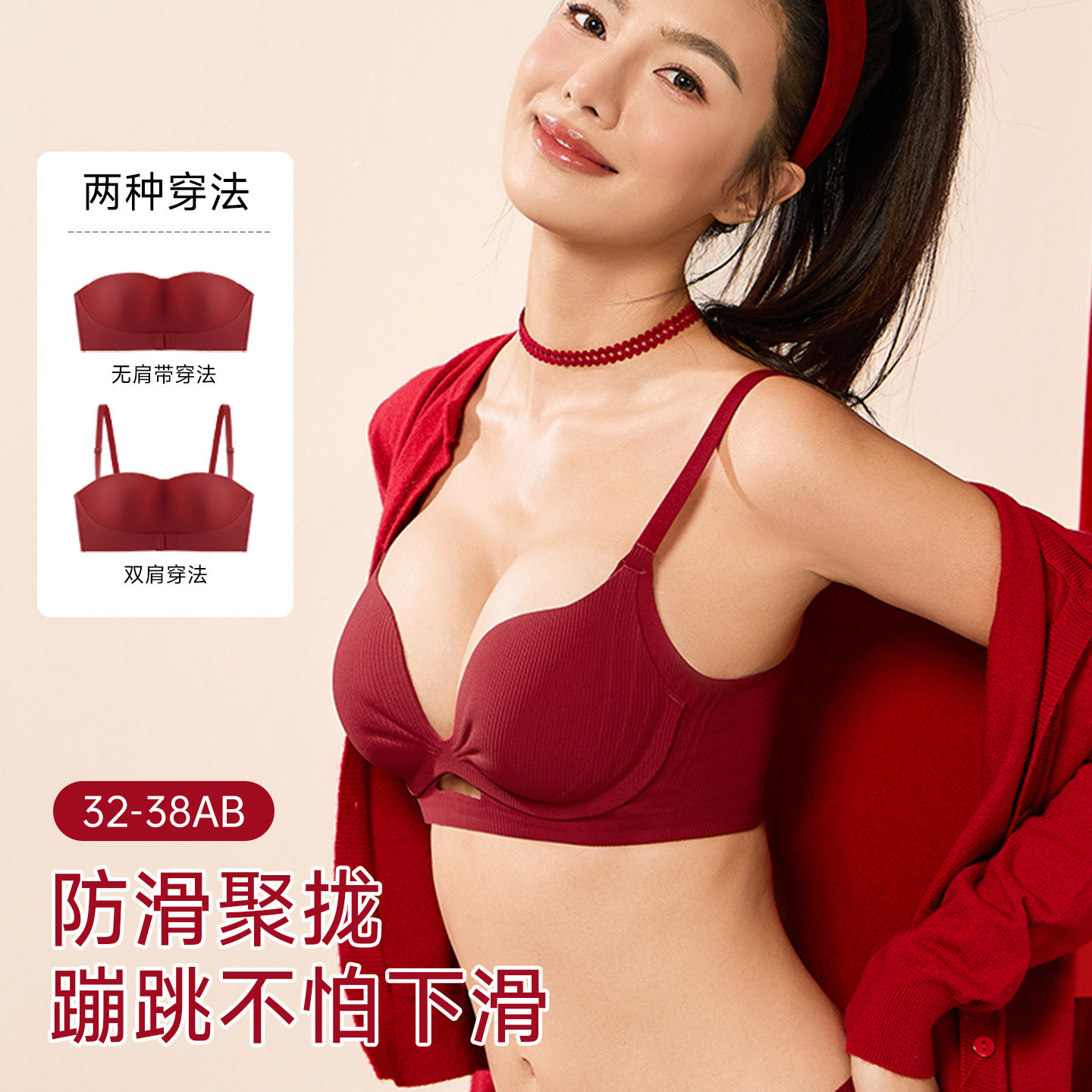 猫人本命年小胸聚拢红色内衣新款无痕显大结婚新娘文胸罩内裤套装