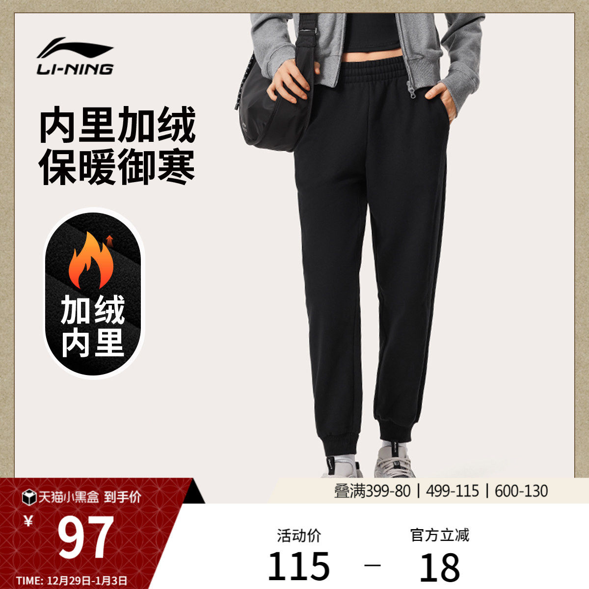 李宁卫裤女秋冬加绒束脚女士宽松休闲裤子女针织百搭毛圈运动长裤