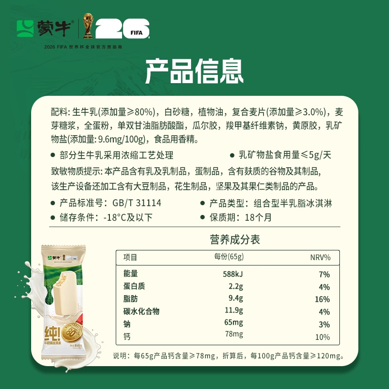 【新品】蒙牛冰淇淋蒙牛纯!牛奶味65g生牛乳冰淇淋
