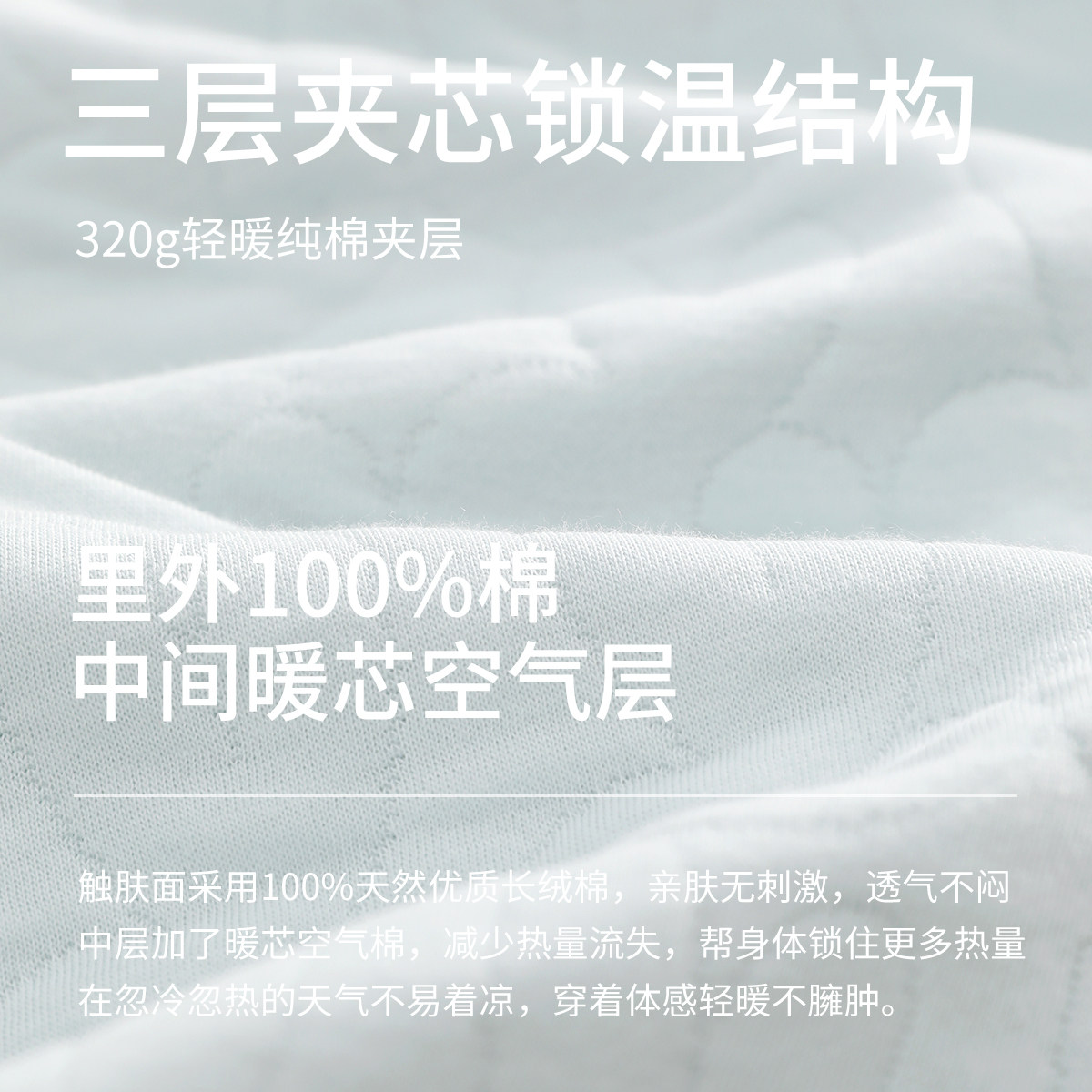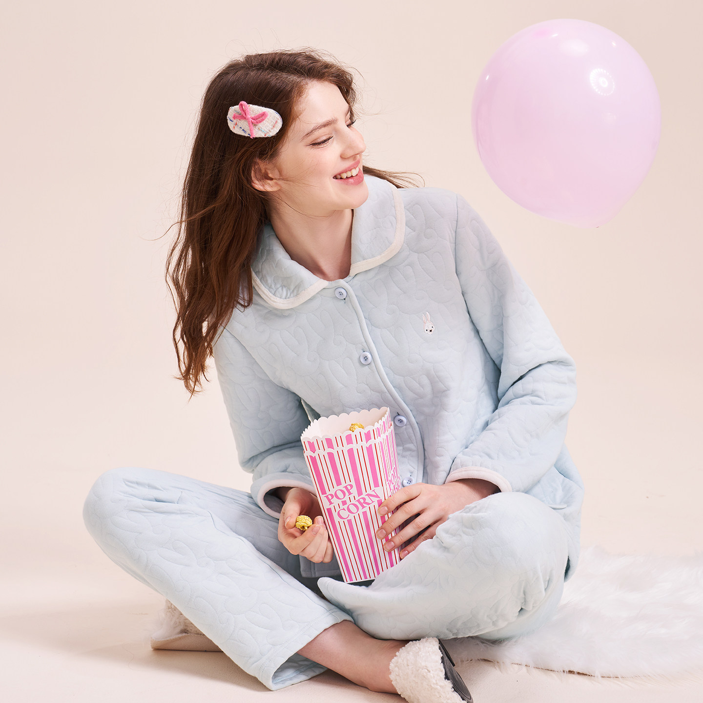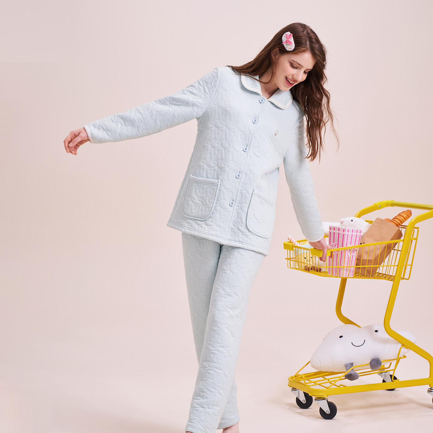 美标秋冬新款三层薄夹棉纯棉睡衣套装女士可外穿保暖全棉质家居服