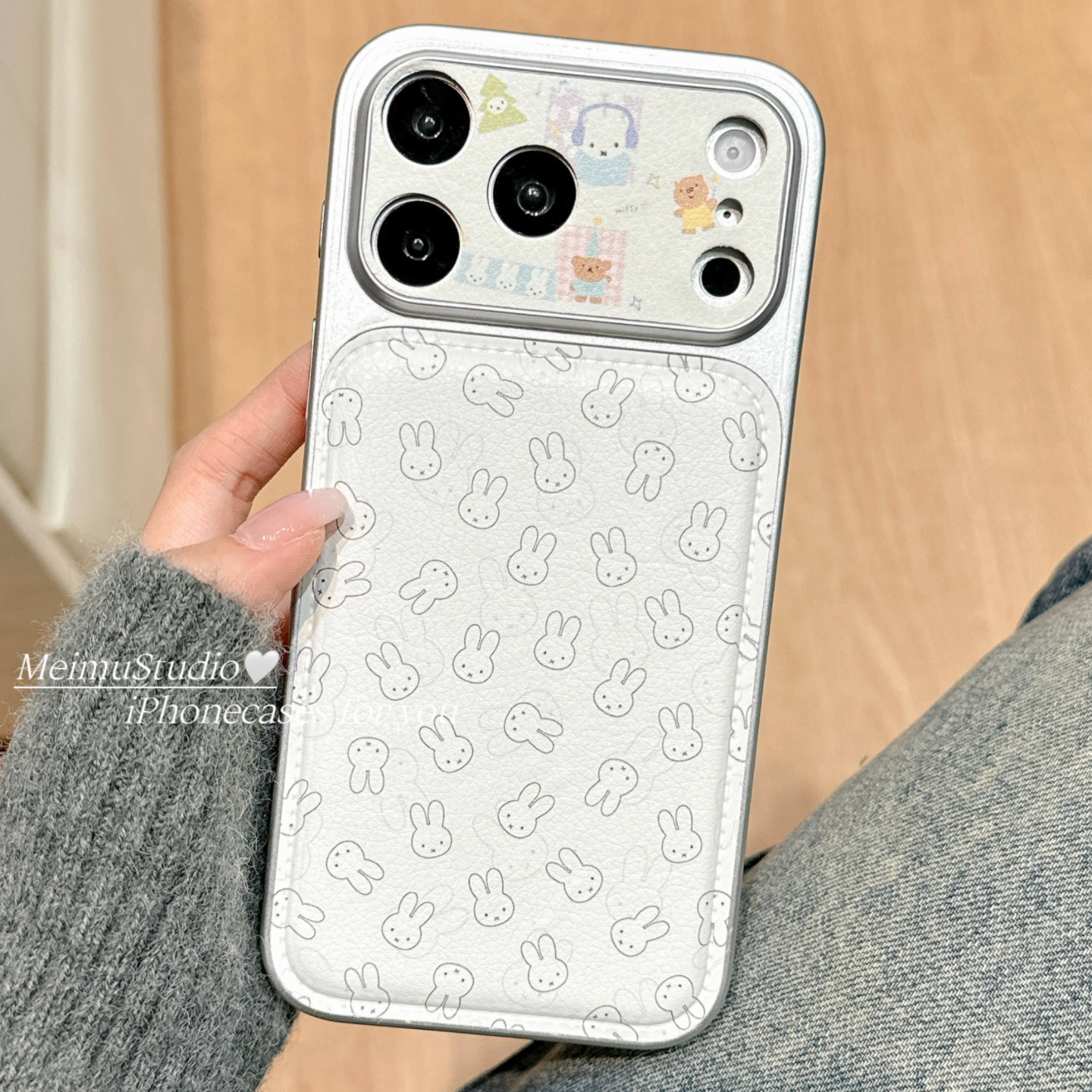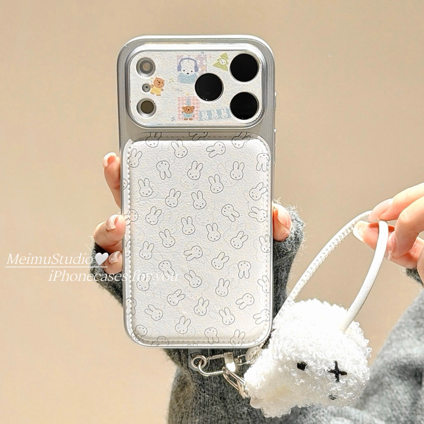 美牧ins简约线条米菲兔带挂绳适用苹果17pro手机壳iphone16promax新款15可爱17女14电镀皮质16日韩风15pm全包