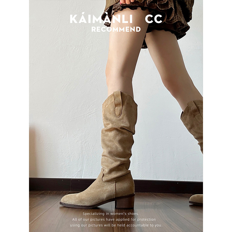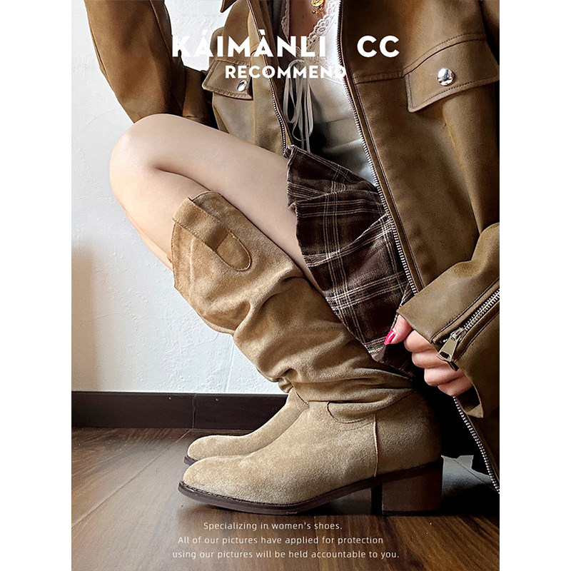 真皮版~卡其色复古尖头不过膝长筒靴女秋冬西部牛仔堆堆靴骑士靴