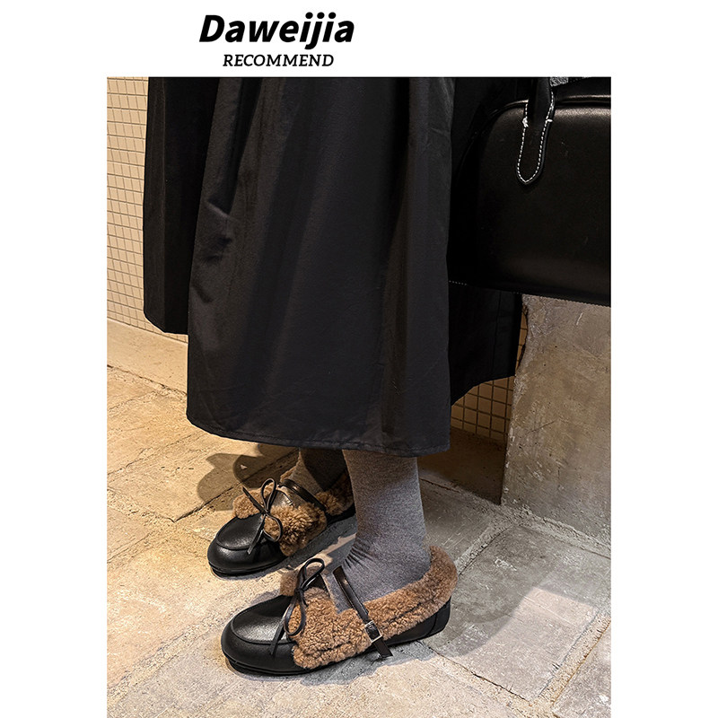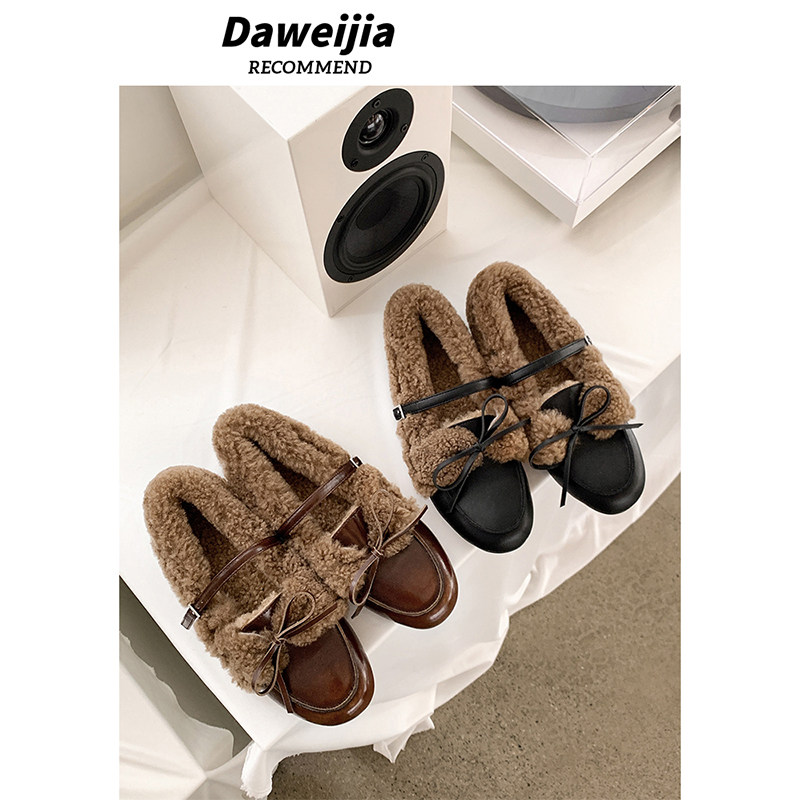 羊皮版复古玛丽珍鞋女方头秋冬季加绒保暖毛毛棉鞋平底晚晚单鞋女