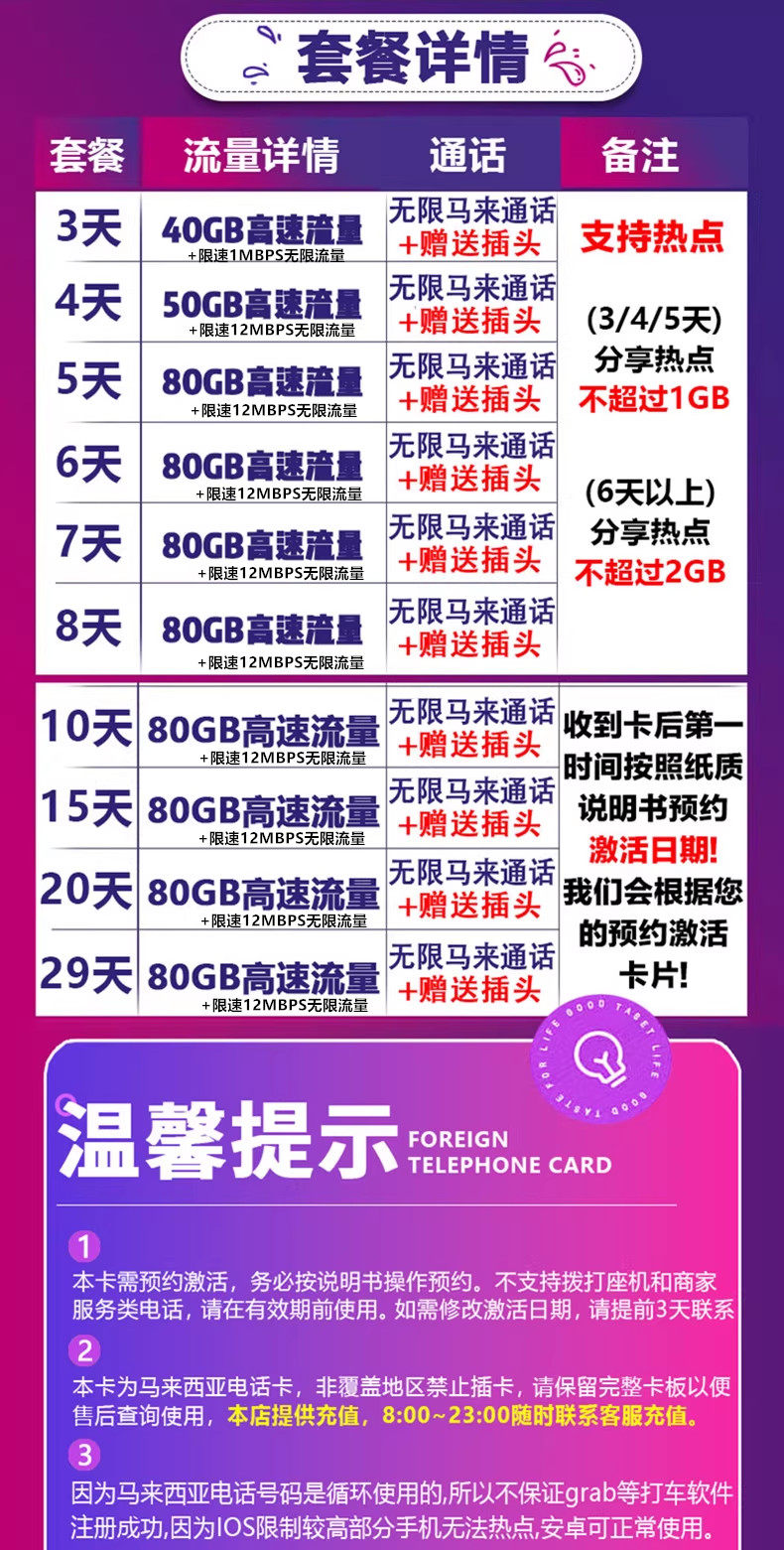 马来西亚大牌运营商,信号强/覆盖广 无限马来通话 支持热点分享