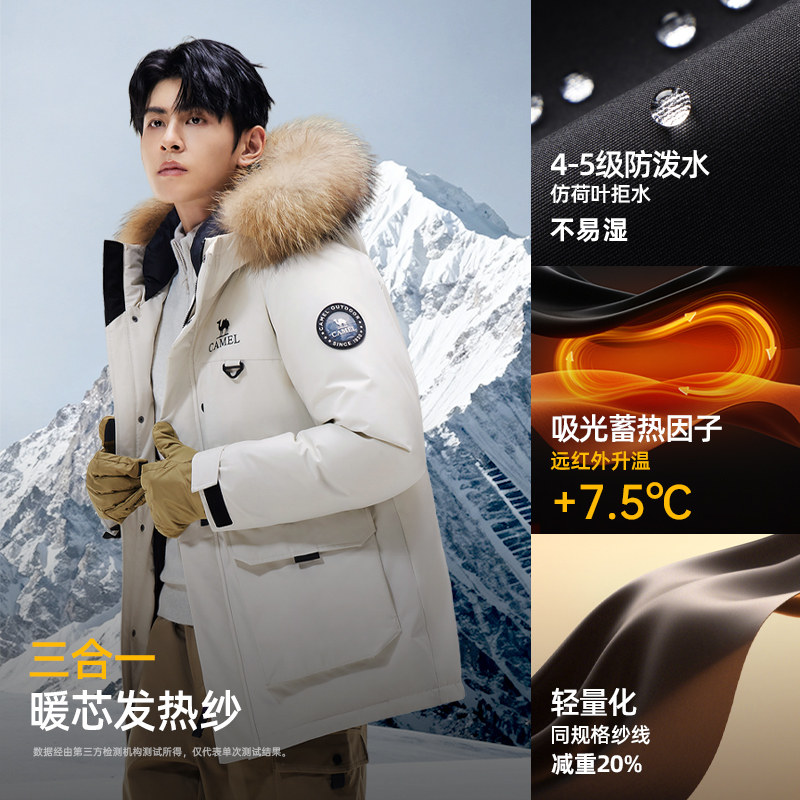 骆驼男装派克鹅绒服男冬季2025新款毛领工装加厚中长款羽绒外套男