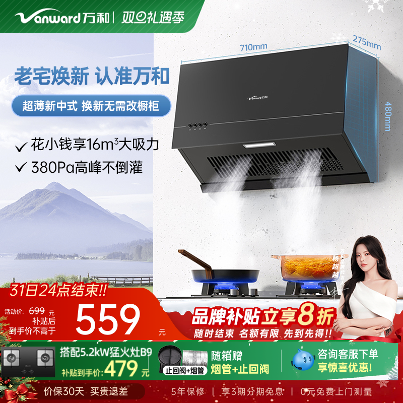 [政府补贴]万和家用厨房小型大吸力抽风机新中式抽油烟机H06C