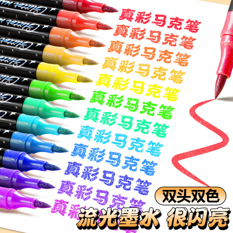 真彩闪光马克笔软头荧光笔双头双色水彩笔流沙银光变色炫彩啫喱闪光笔小学生儿童幼儿园画笔流光闪粉手帐笔