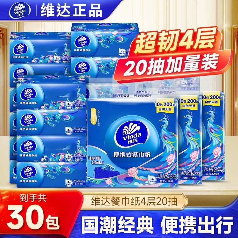 维达国潮小方巾四层20片30包餐巾纸家用便携卫生纸抽学生宿舍纸抽