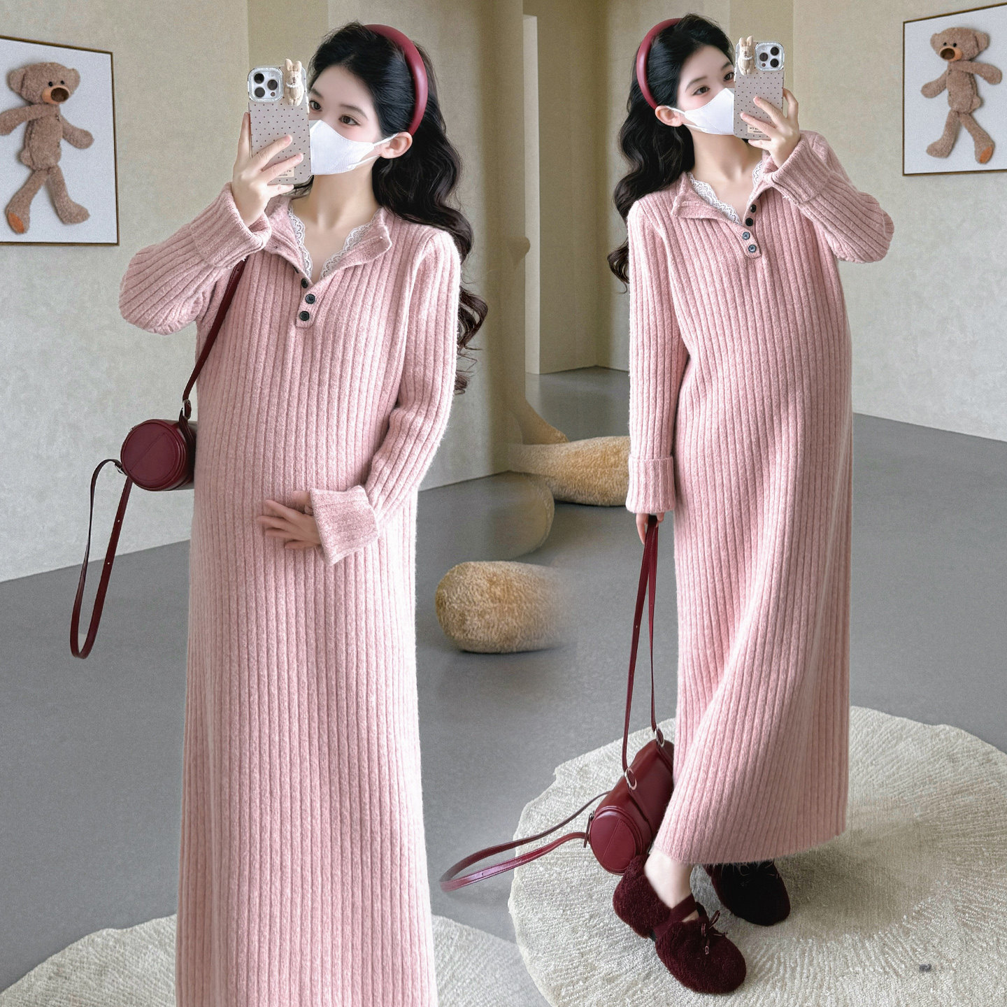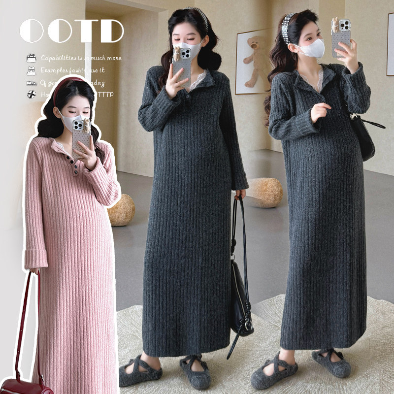 婧麒高级感孕妇装蕾丝v领孕妇连衣裙冬装孕期新款孕妇裙子时尚女