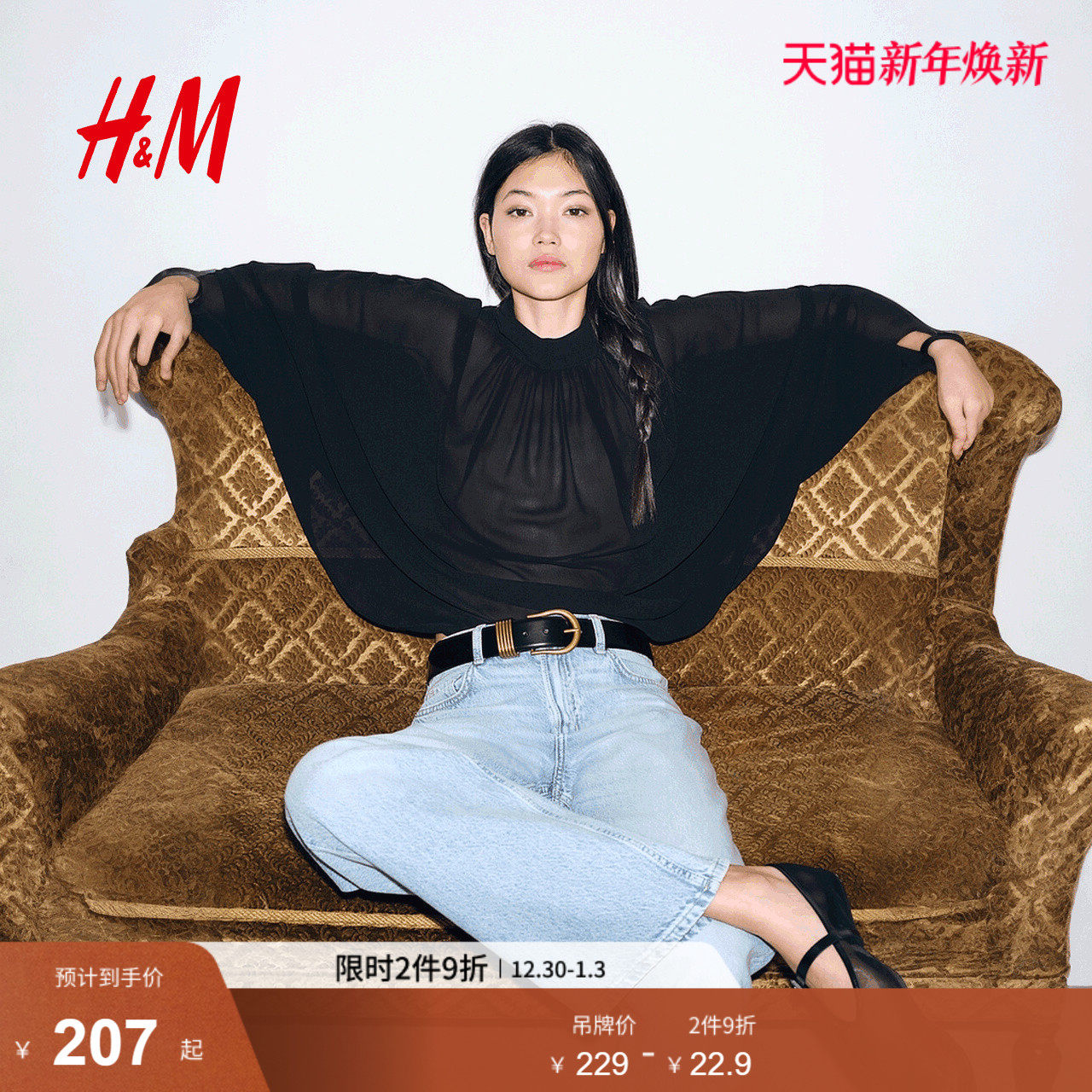 HM女装透气5袋式棉质直筒高腰阔腿牛仔裤休闲长裤0871889