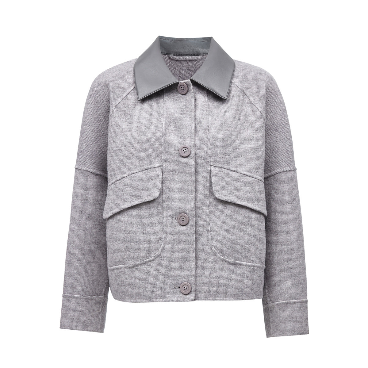 Vero Moda奥莱毛呢外套女秋冬新款拼接PU领蝙蝠袖短款休闲大衣