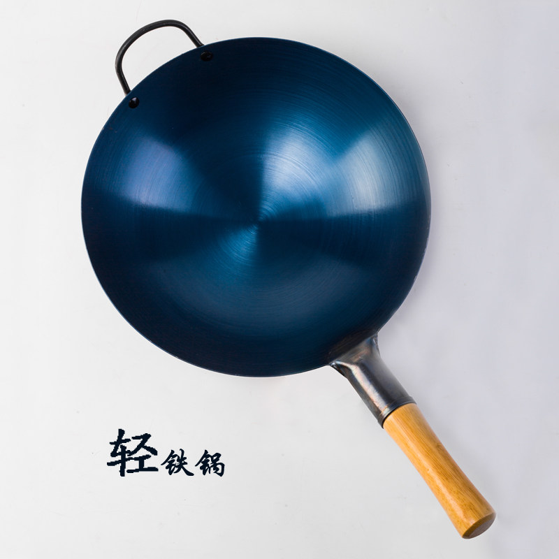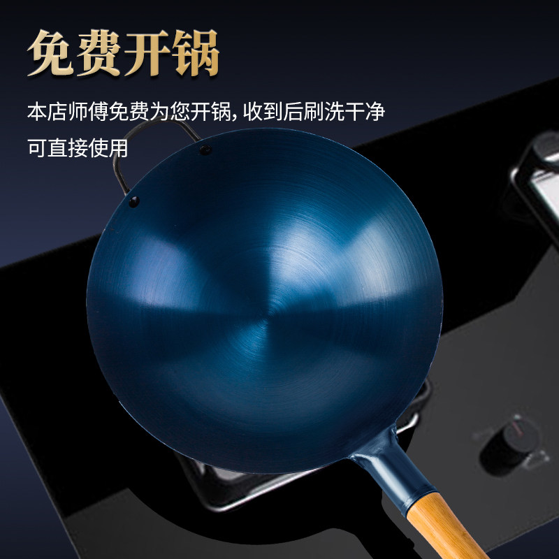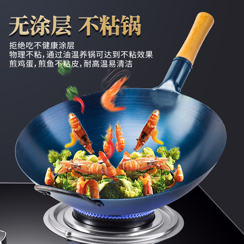 饭店厨师用纯铁锅家用燃气灶适用炒菜锅中式圆底带耳木柄炒锅不粘